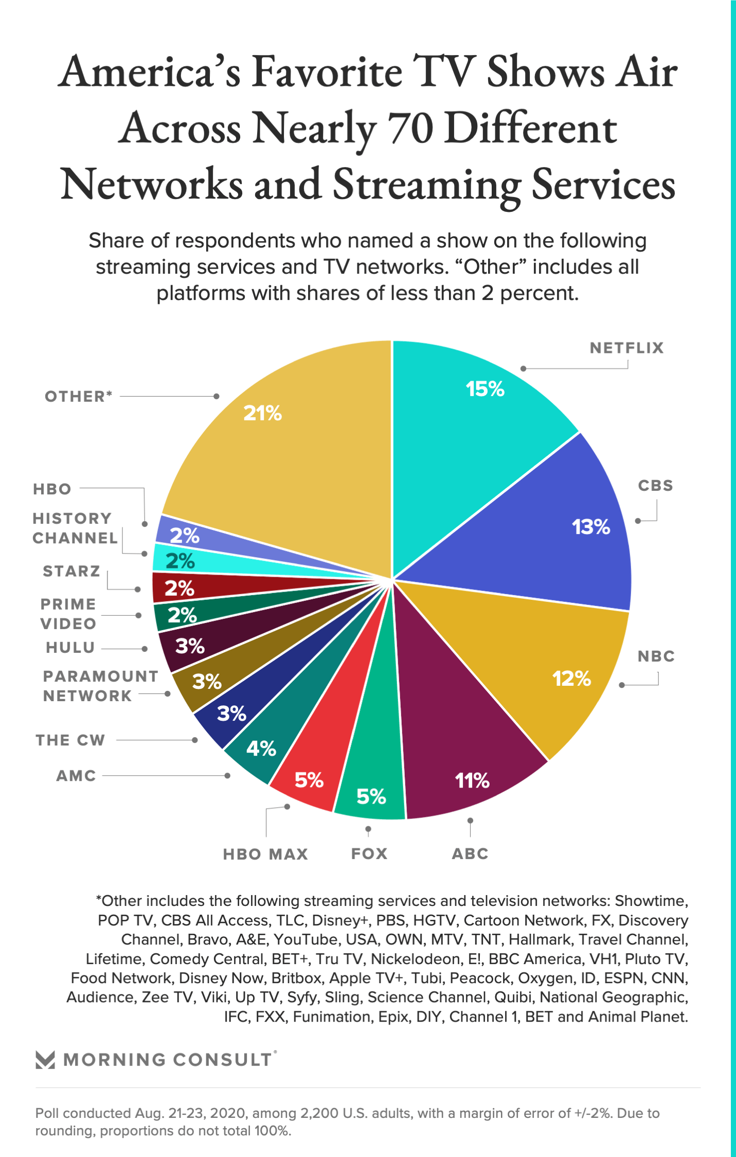 Respondents in an Aug. 21-23 survey were provided a blank space and asked to name, in their opinion, the best TV show that has aired new episodes in the past year. Sixty-eight of the 1,650 U.S. adults who named a TV program, or 4 percent, listed the CBS procedural “NCIS” as the best program, making it the most loved in the poll. Forty-nine respondents said the same of Paramount Network’s “Yellowstone,” while 46 selected NBC’s “This Is Us.” Those three shows make up roughly 10 percent of responses in the survey, which was conducted among 2,200 U.S. adults and has an overall margin of error of 2 percentage points.