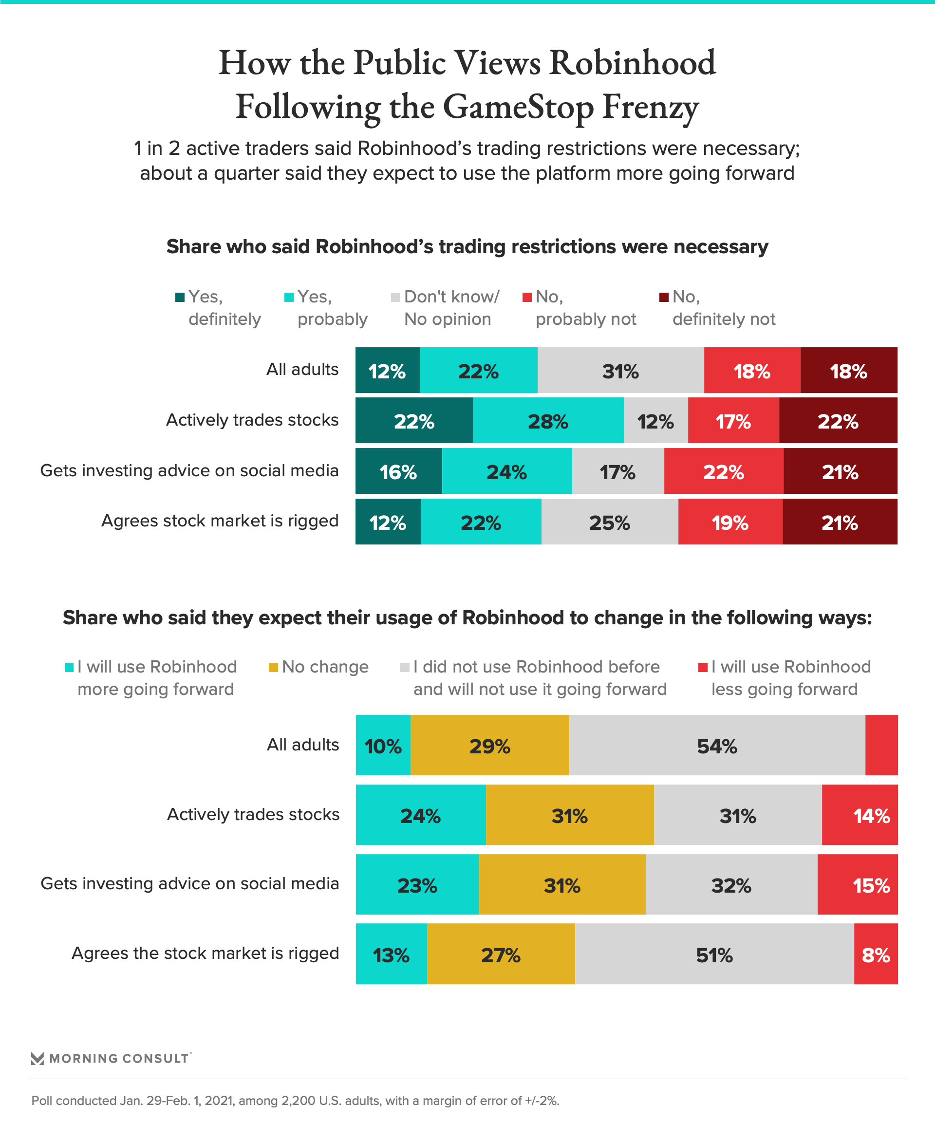 Adults were split on whether Robinhood’s trading restrictions were necessary, with 34% saying they were and 36% saying they were not.