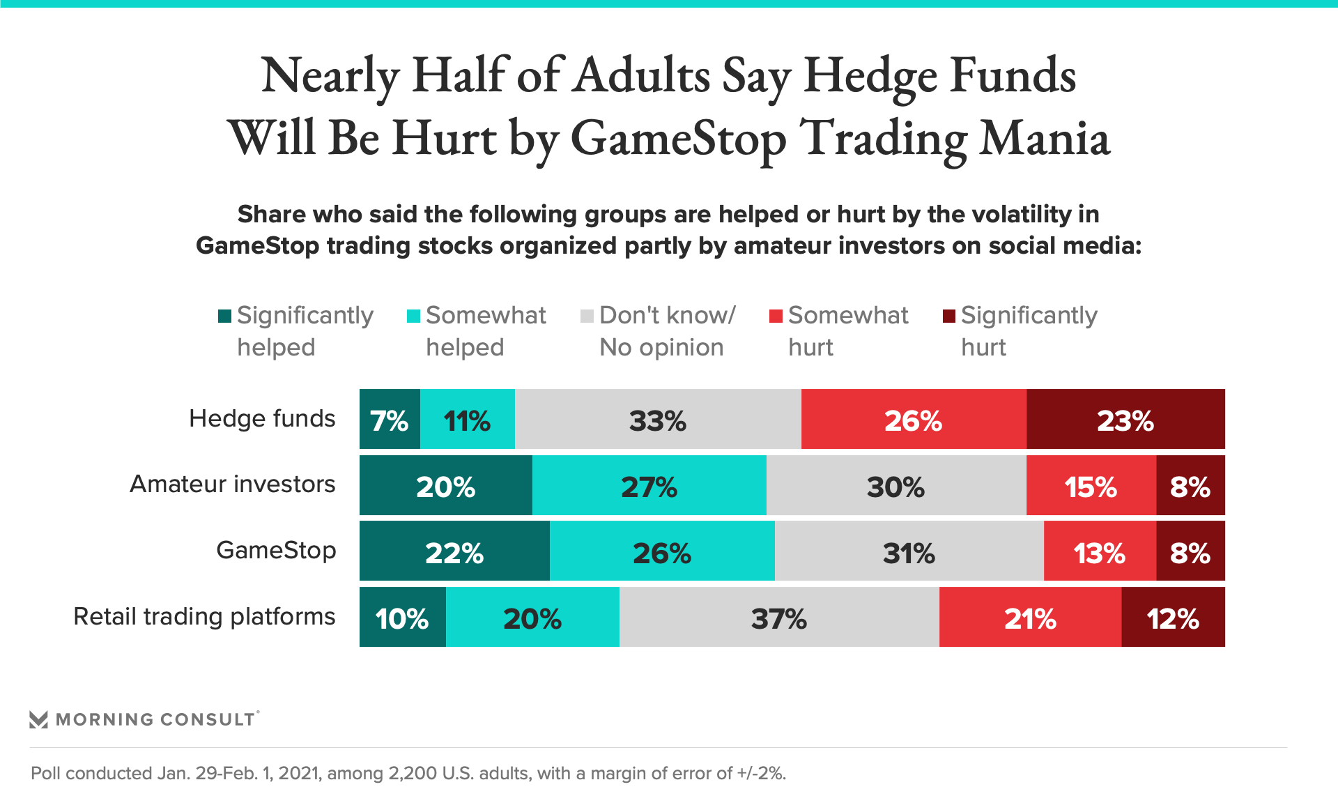 The sentiment around hedge funds is reflected more specifically in the GameStop story. Forty-nine percent of adults said that hedge funds will be “somewhat” or “strongly” hurt by the GameStop trading, while relatively few respondents thought amateur investors (22 percent) or GameStop itself (21 percent) would be harmed by the trading volatility. Since the poll was conducted, GameStop shares have tumbled, which could end up coming back and harming the retail investors.