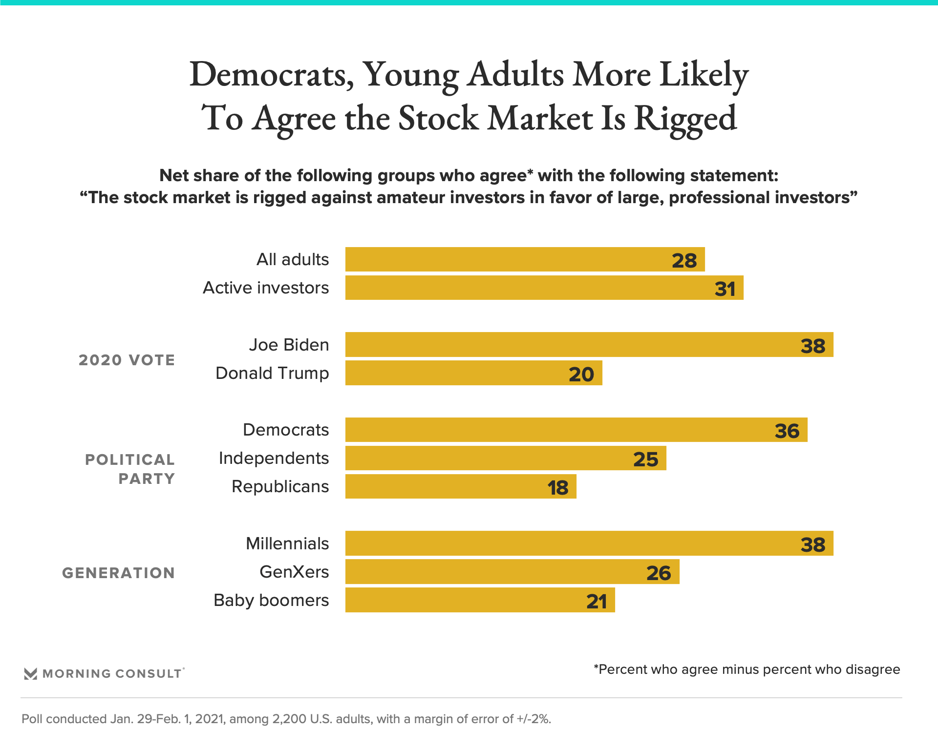 And despite some theorizing in the media about the GameStop drama’s connection to the undercurrent of populism in the Trump movement, Democrats and Biden voters tended to agree more that the stock market is rigged compared with Republicans and Trump voters. Millennials, compared to Gen Xers and baby boomers, also agreed with the statement at a higher rate.