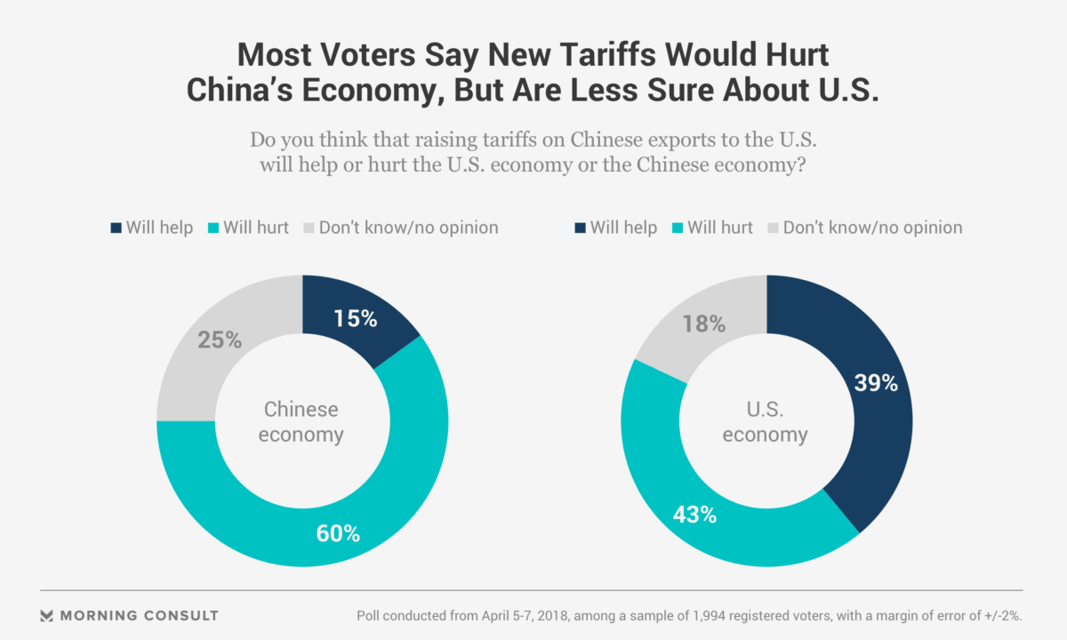 Forty-eight percent of respondents in a Morning Consult/Politico survey conducted April 5-7 said they either strongly or somewhat support the tariffs of 25 percent on about 1,300 products in retaliation to Beijing’s allegedly ineffective enforcement of U.S. companies’ intellectual property rights. Thirty-five percent of voters said they oppose the duties and 17 percent said they did not know or had no opinion.