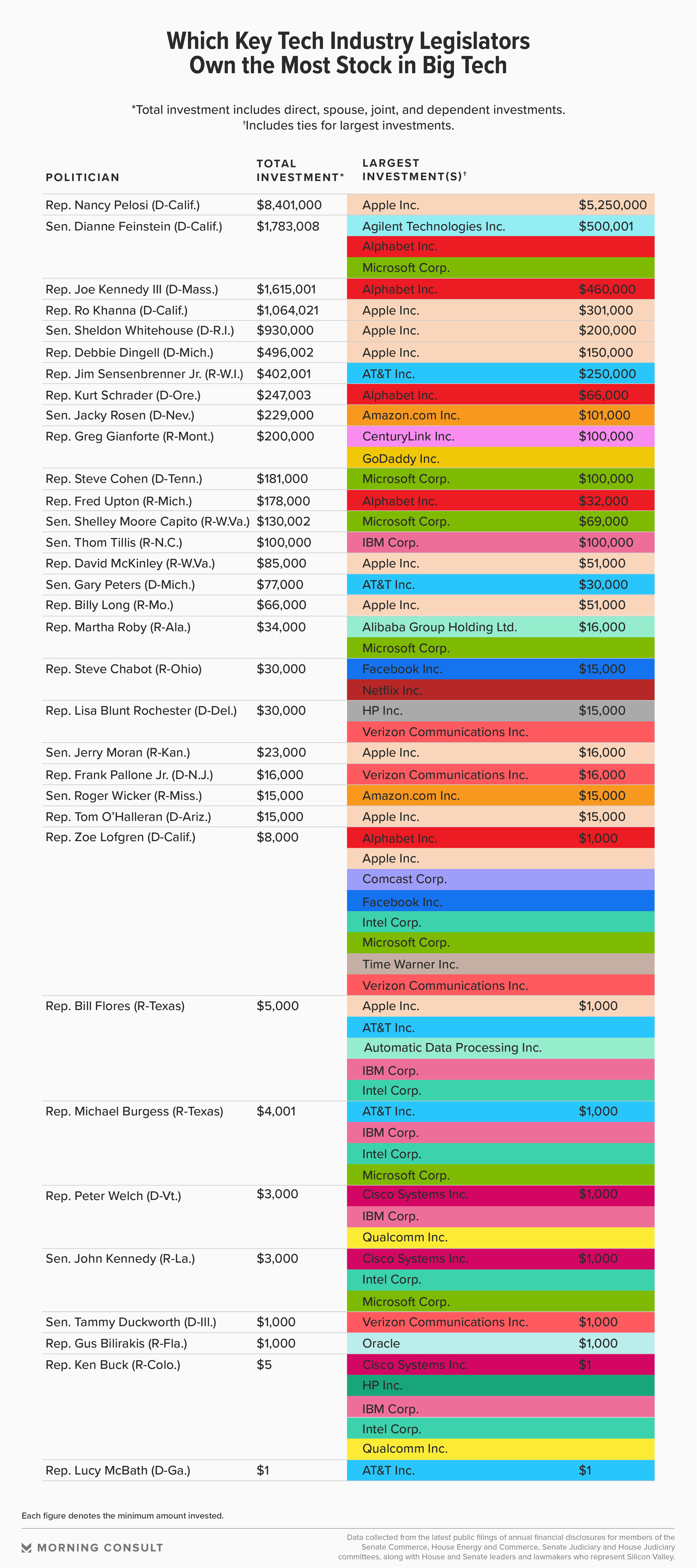 Of the 145 lawmakers who sit in positions that have the power to sway negotiations on tech legislation, 33 hold tech shares through personal holdings, a spouse or a dependent child. Annual financial disclosures included in Morning Consult’s analysis were filed this year or in 2018 and represent the member’s finances from the year prior, and all figures come from the latest filings as of July 2. (The full data set can be downloaded here.)