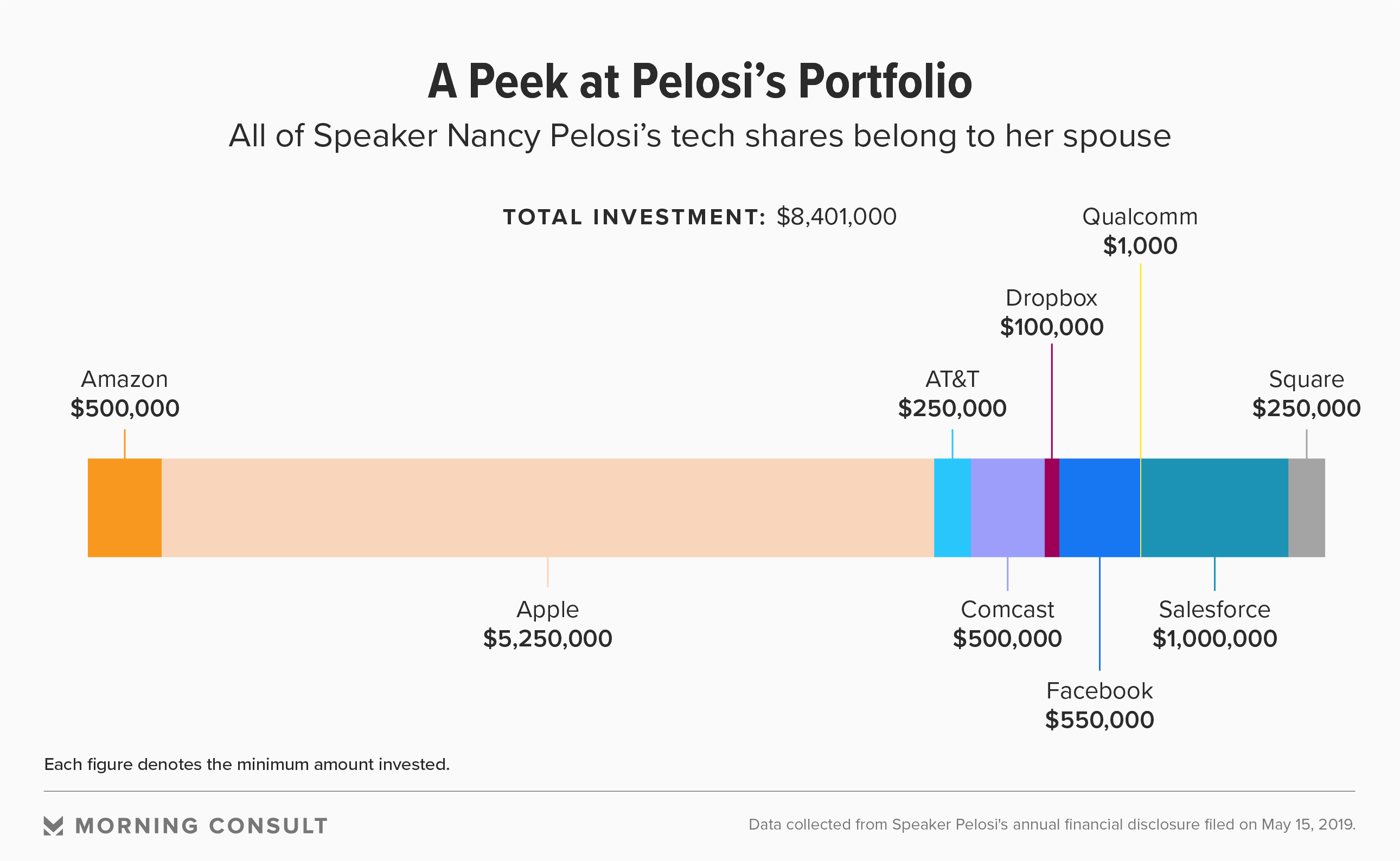 And Pelosi’s $5.25 million in Apple Inc. stock was the reason that Apple represented the largest share of tech investments among lawmakers, with $6.1 million. The companies also popular among lawmakers were Microsoft Corp., Alphabet Inc. and Amazon.com Inc., with investments totaling at least $1.6 million, $1.4 million and $1.2 million each.