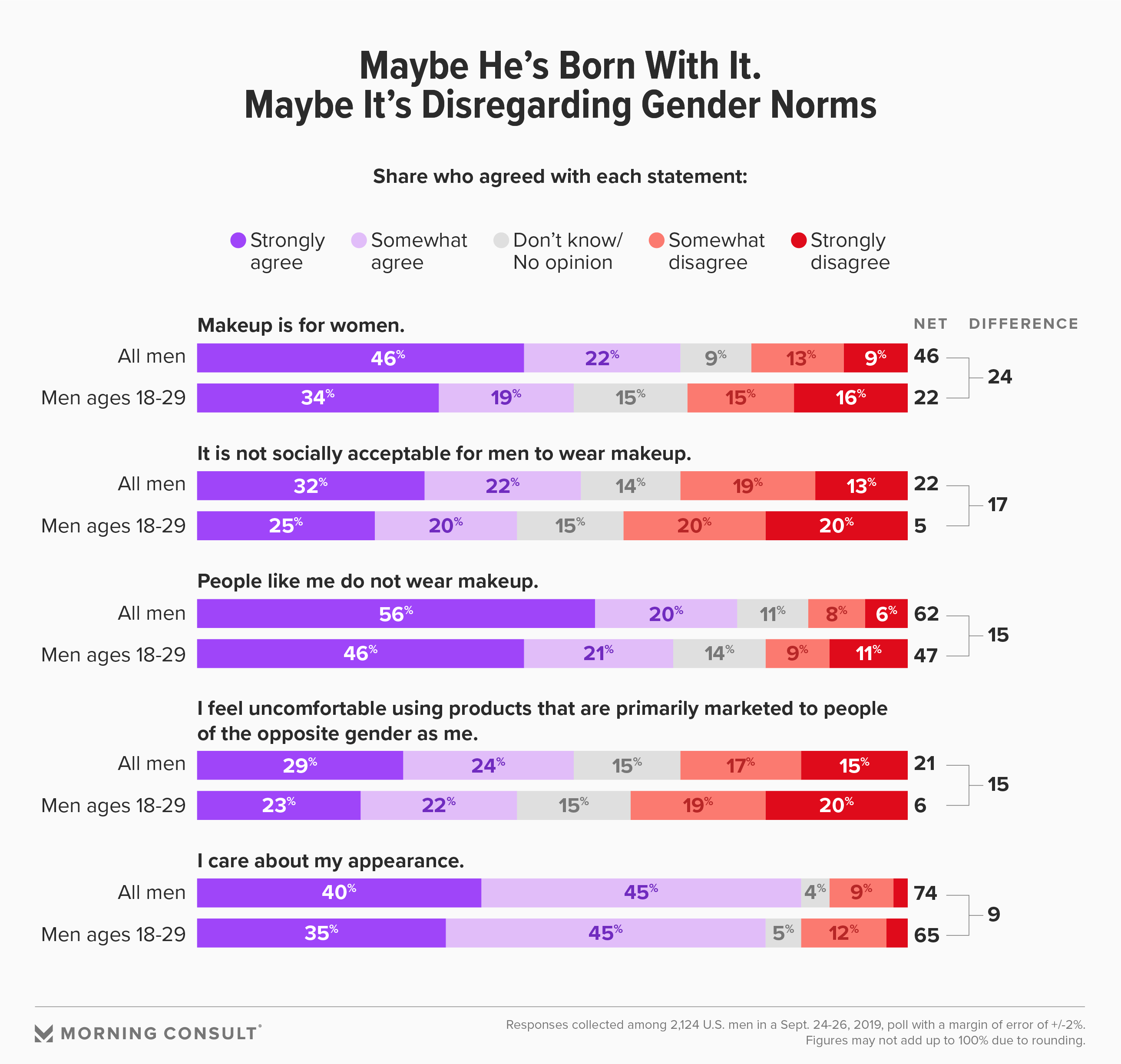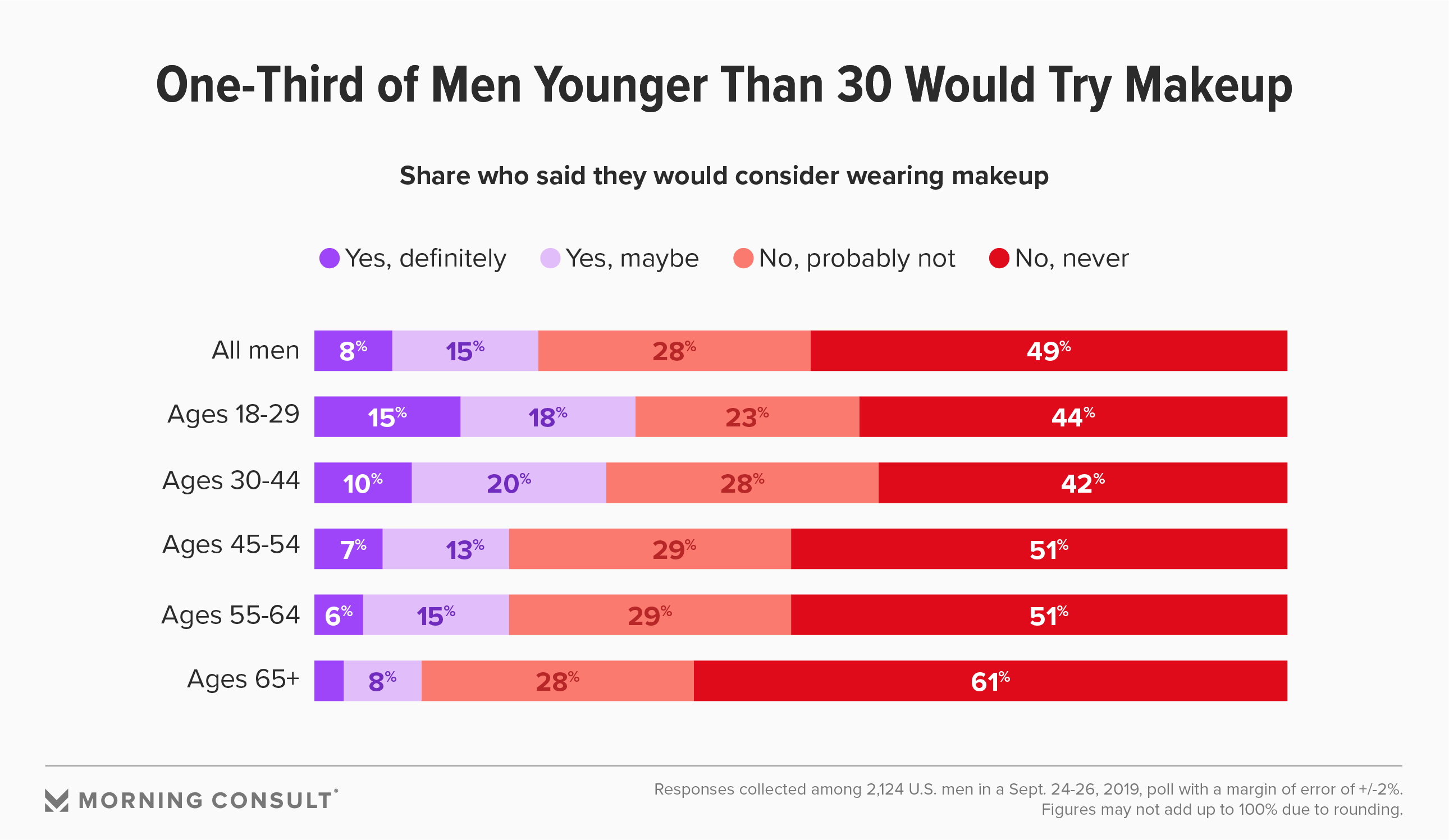 Thirty-three percent of men ages 18-29 said they would consider wearing makeup, while another 30 percent of men ages 30-44 reported said they’d be open to the idea as well. The data collected from 2,142 men in a Sept. 24-26 survey of 4,400 U.S. adults has a margin of error of 2 percentage points.