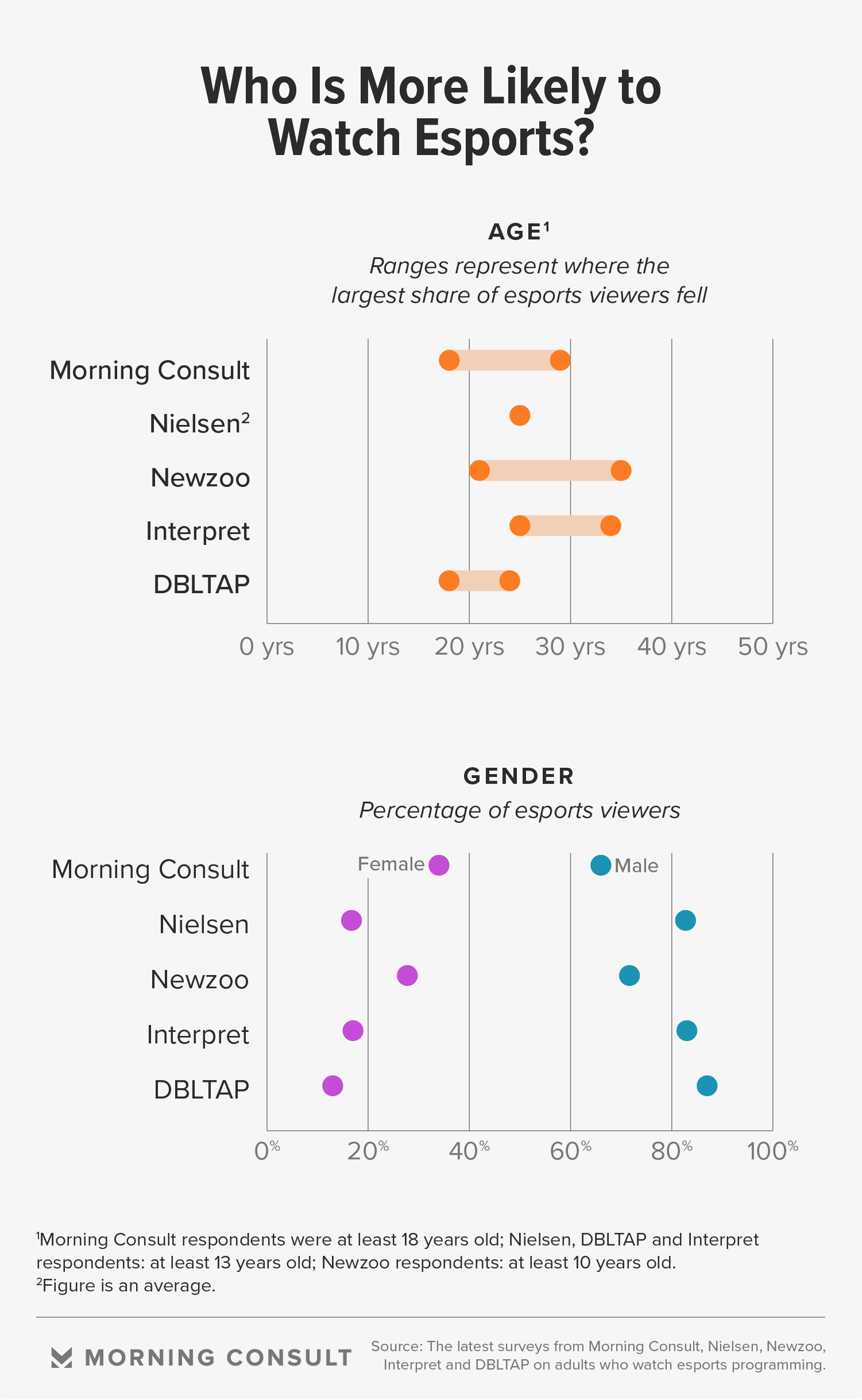 Nielsen Holdings PLC, for example, puts esports watchers’ average age at 25, according to the latest Nielsen Esports Fan Insights data. Interpret, a California-based market researcher, instead uses a range of 25-34.