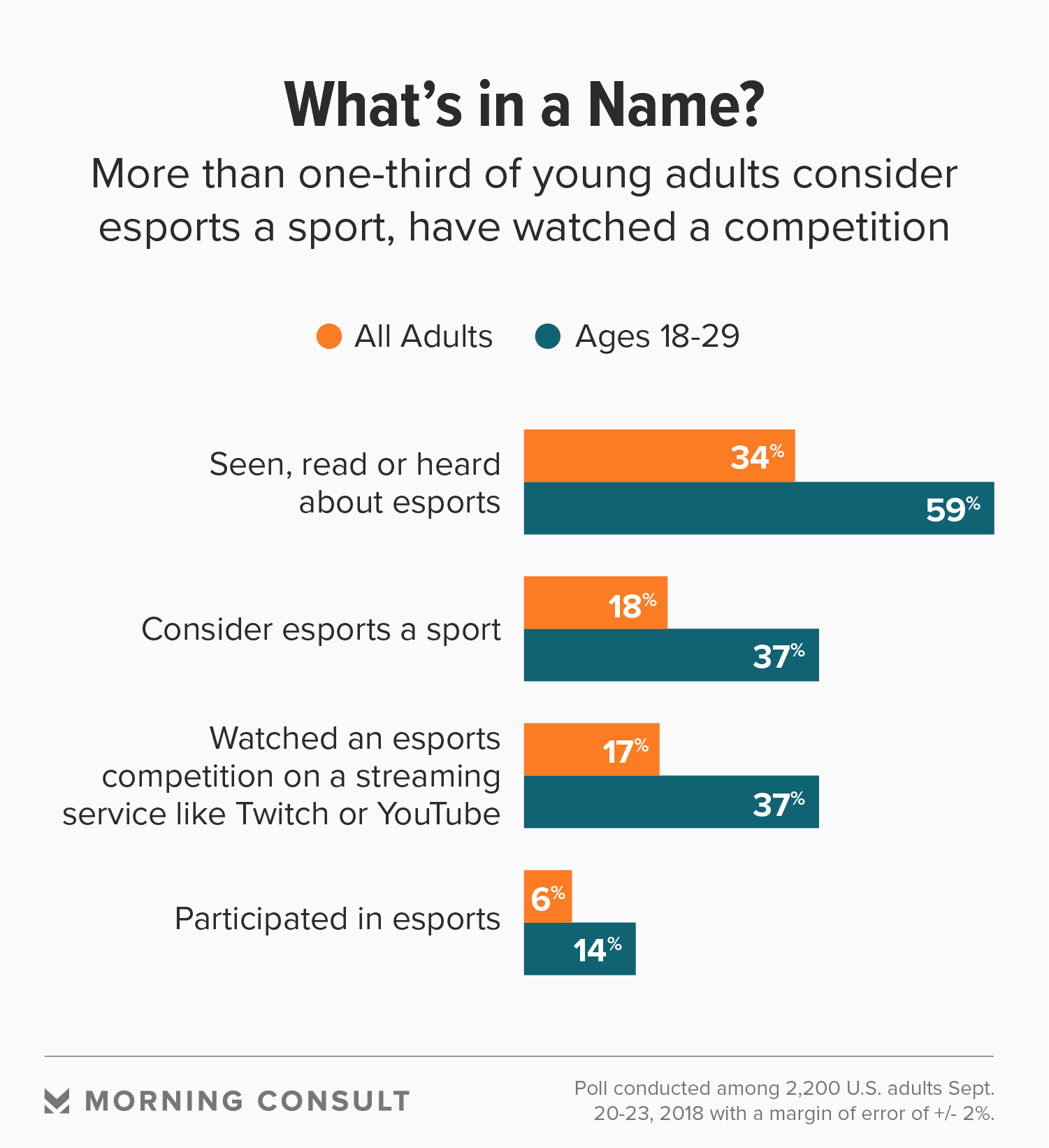 And a Sept. 20-23 Morning Consult survey showed that 83 percent of Americans don’t think esports is a sport or weren’t sure. But interest may be growing: Seventeen percent of those surveyed reported watching an esports tournament, and that number rose to 37 percent among the youngest adults (ages 18-29).