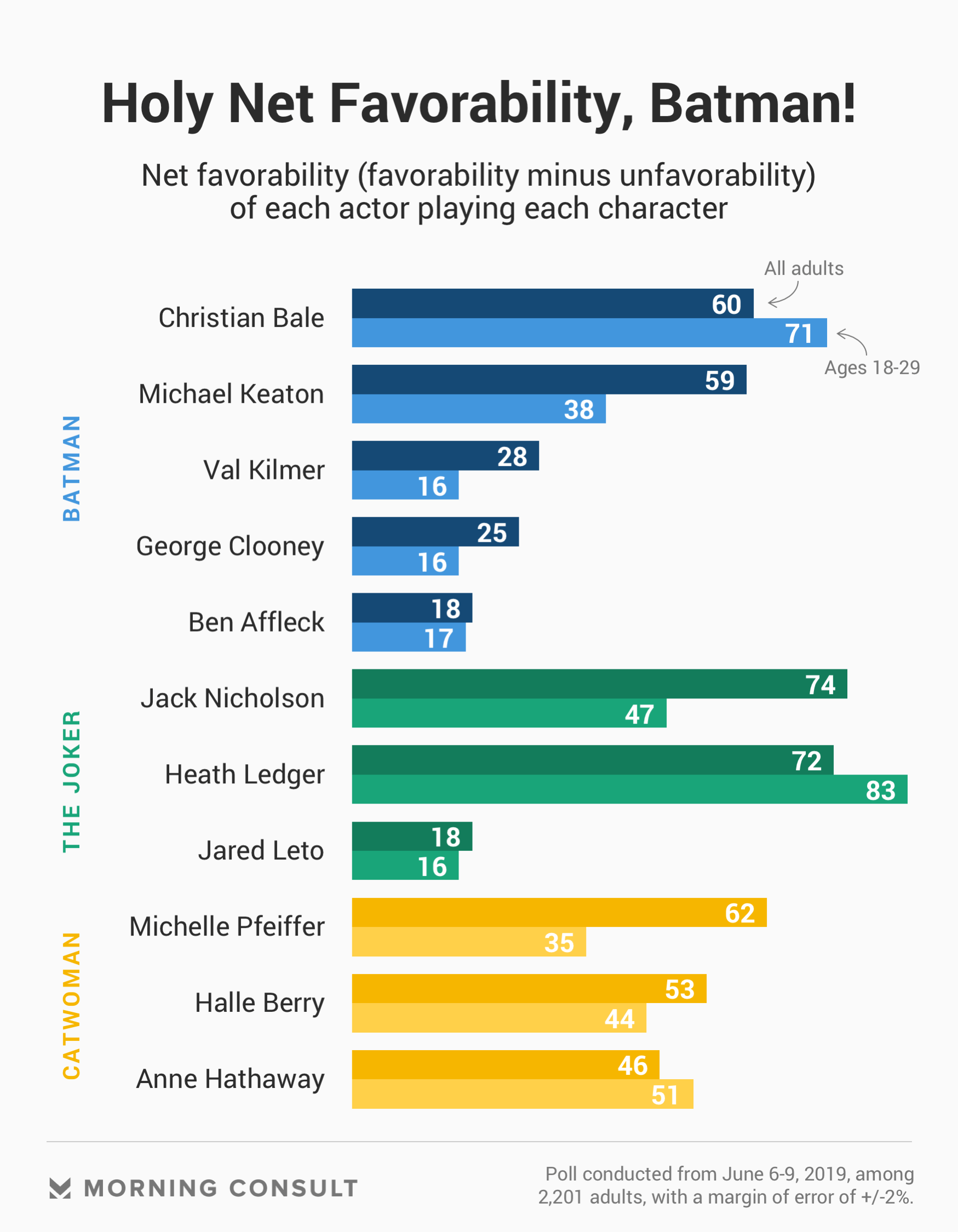 Bale’s Batman had a net favorability of 71 points among young adults, 11 points higher than his net among all adults. Ledger and Hathaway outranked public favorites Nicholson and Catwoman actress Michelle Pfeiffer among the younger demographic.