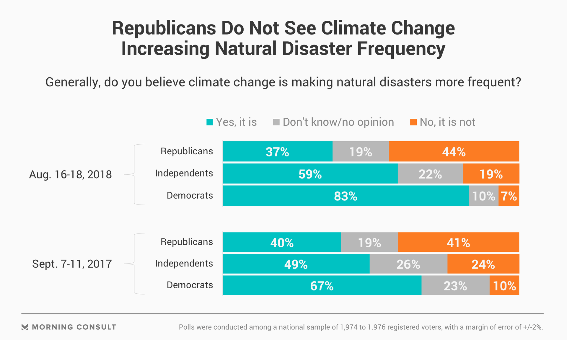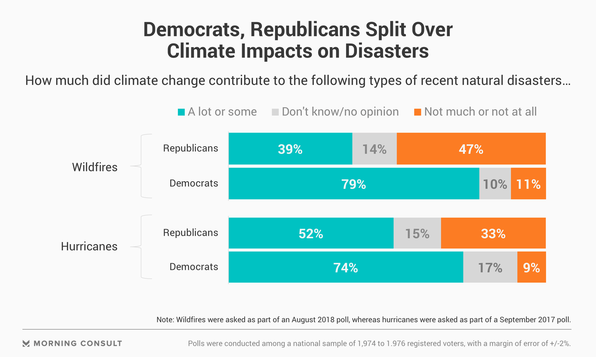 Republicans are the only group of voters in which a plurality believes climate change is neither increasing the frequency nor the strength of natural disasters, according to the most recent Morning Consult poll. Majorities of Democrats and independents say they believe climate change is making natural disasters worse in those respects.