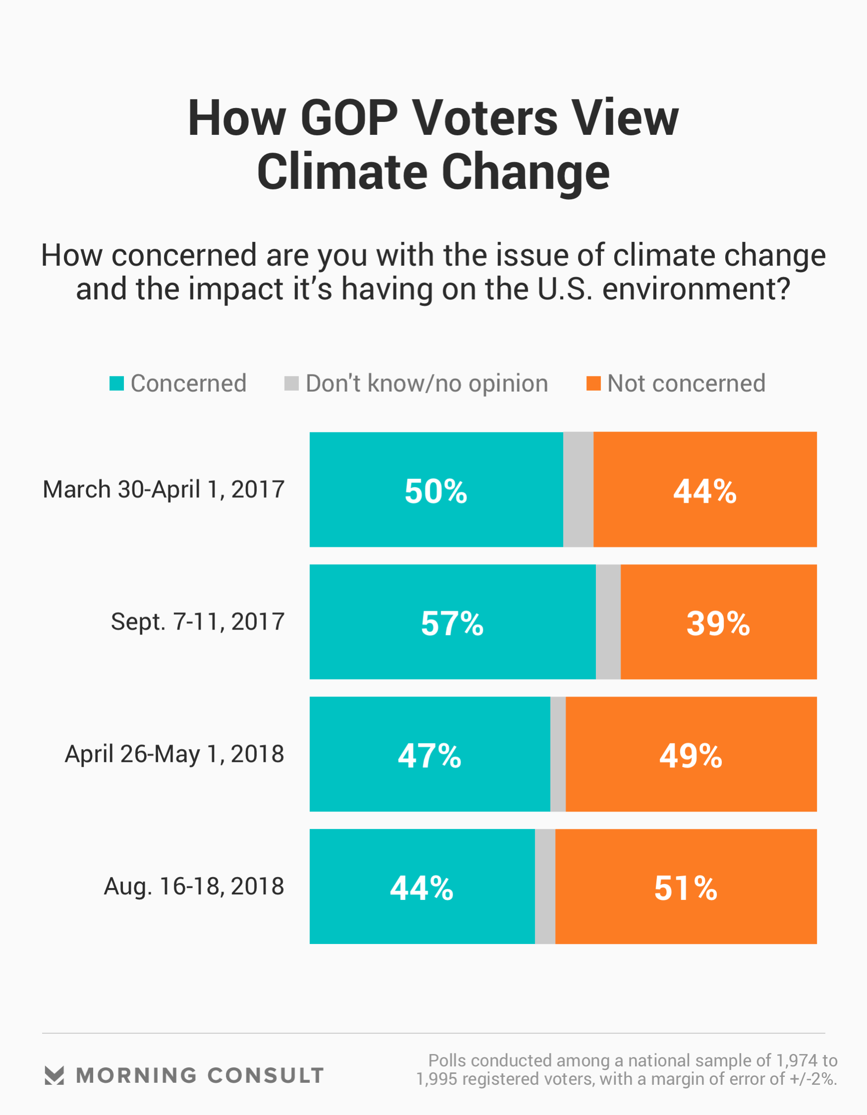 When hurricanes battered the Gulf Coast last year, a majority of Republican voters expressed concern about climate change in a Morning Consult/Politico poll. Now, during this year’s destructive wildfire season, which scientists have attributed partially to hotter weather patterns, a majority of Republicans say they are not worried about climate change, according to a new poll.