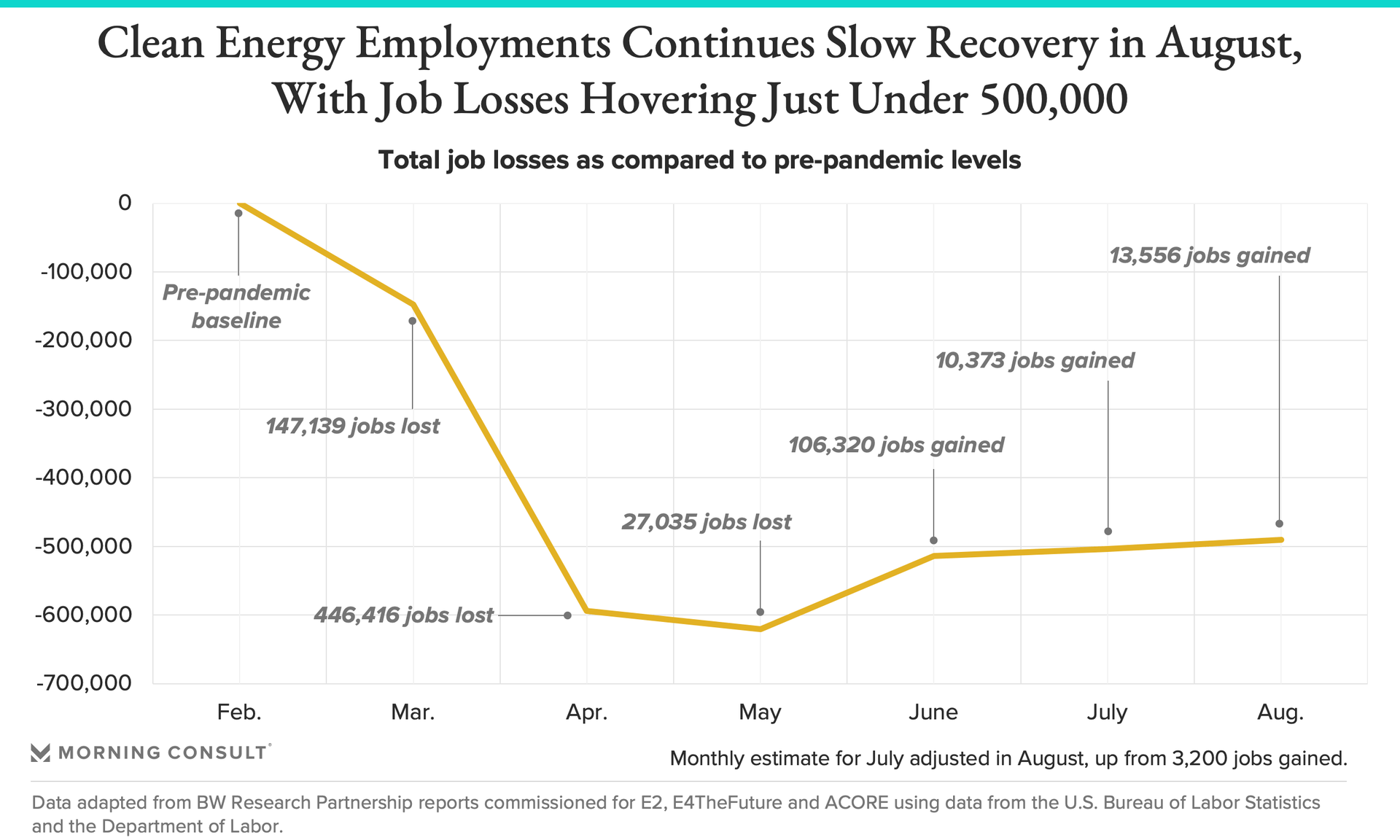 The clean energy sector continues to feel the pain of the coronavirus pandemic’s impact on the economy, adding just 13,600 jobs in August.