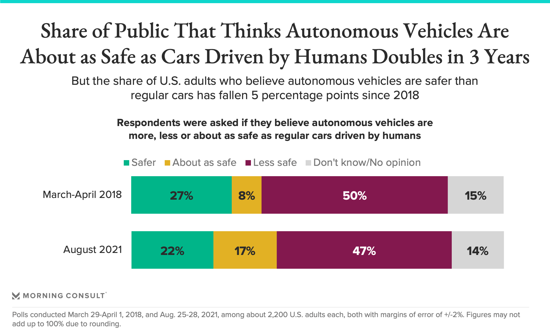 Seventeen percent of adults believe AVs are as safe as regular cars driven by humans, up from 8 percent who said the same in 2018, although the number of people who believe self-driving vehicles are safer than regular cars has dropped from 27 percent in 2018 to 22 percent in 2021.