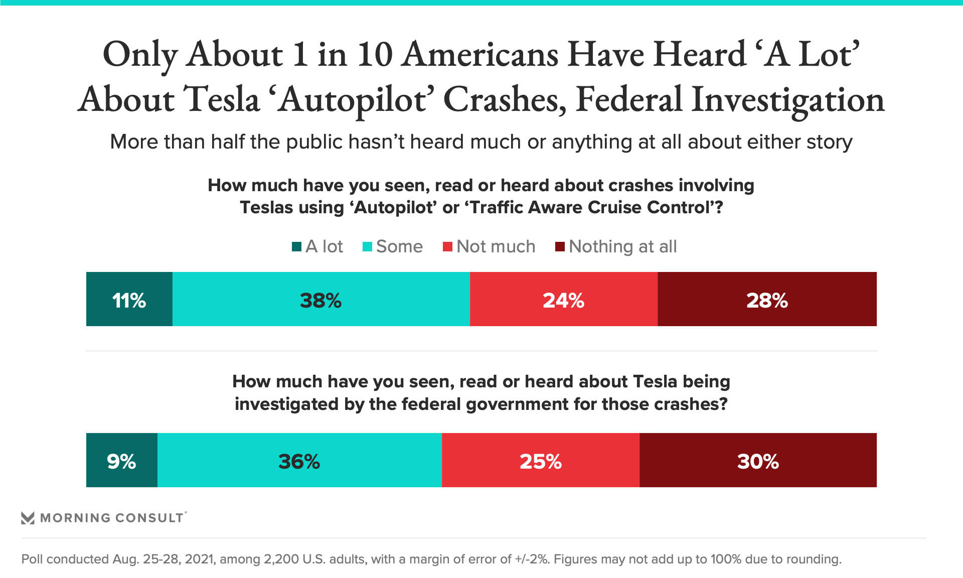 While Tesla’s AV crashes have received national attention from regulators and lawmakers, polling suggests that news of the NHTSA’s investigation – and the crashes themselves – has failed to break through to the general public.