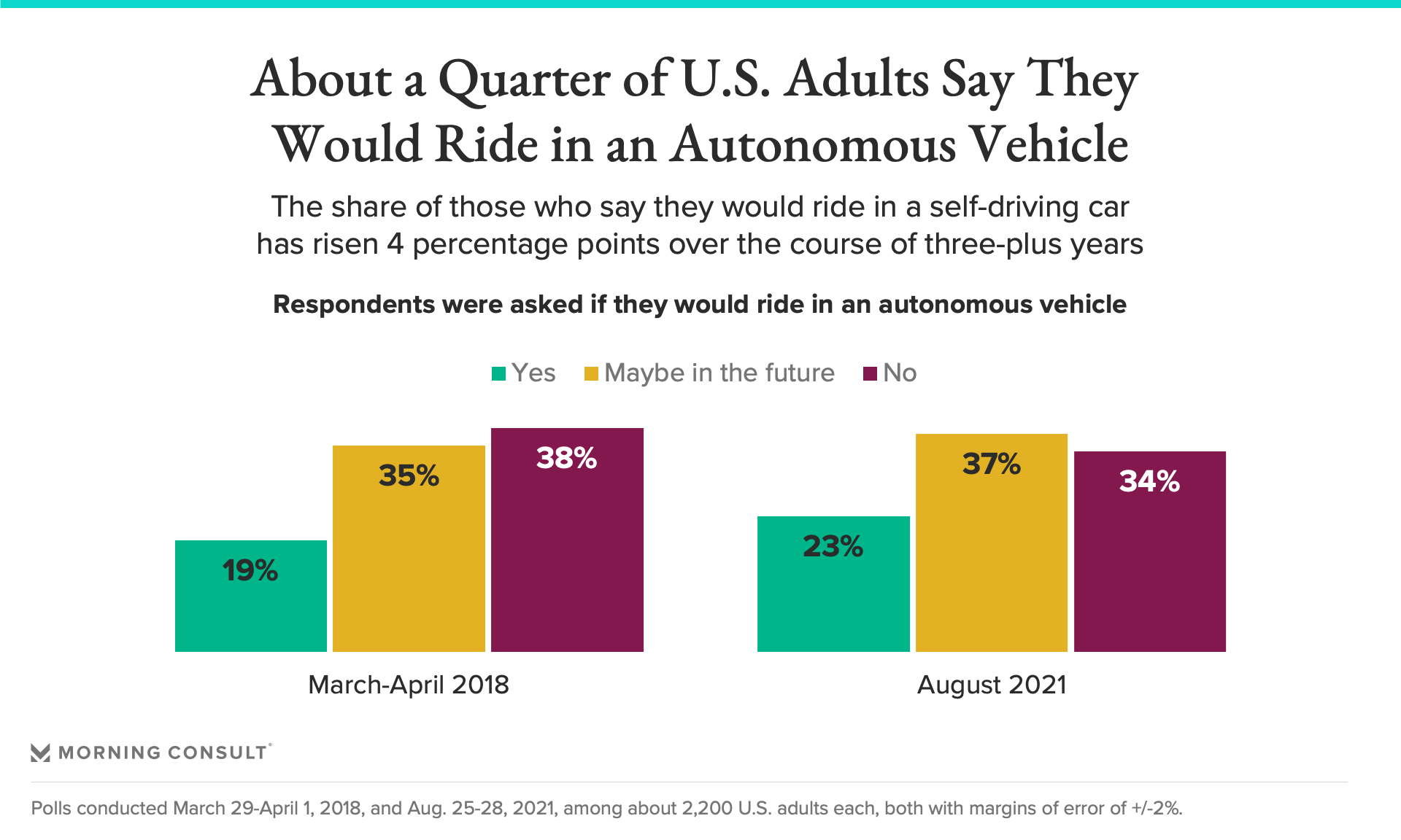 - 17% believe autonomous vehicles are as safe as cars driven by humans, up from 8% in 2018.