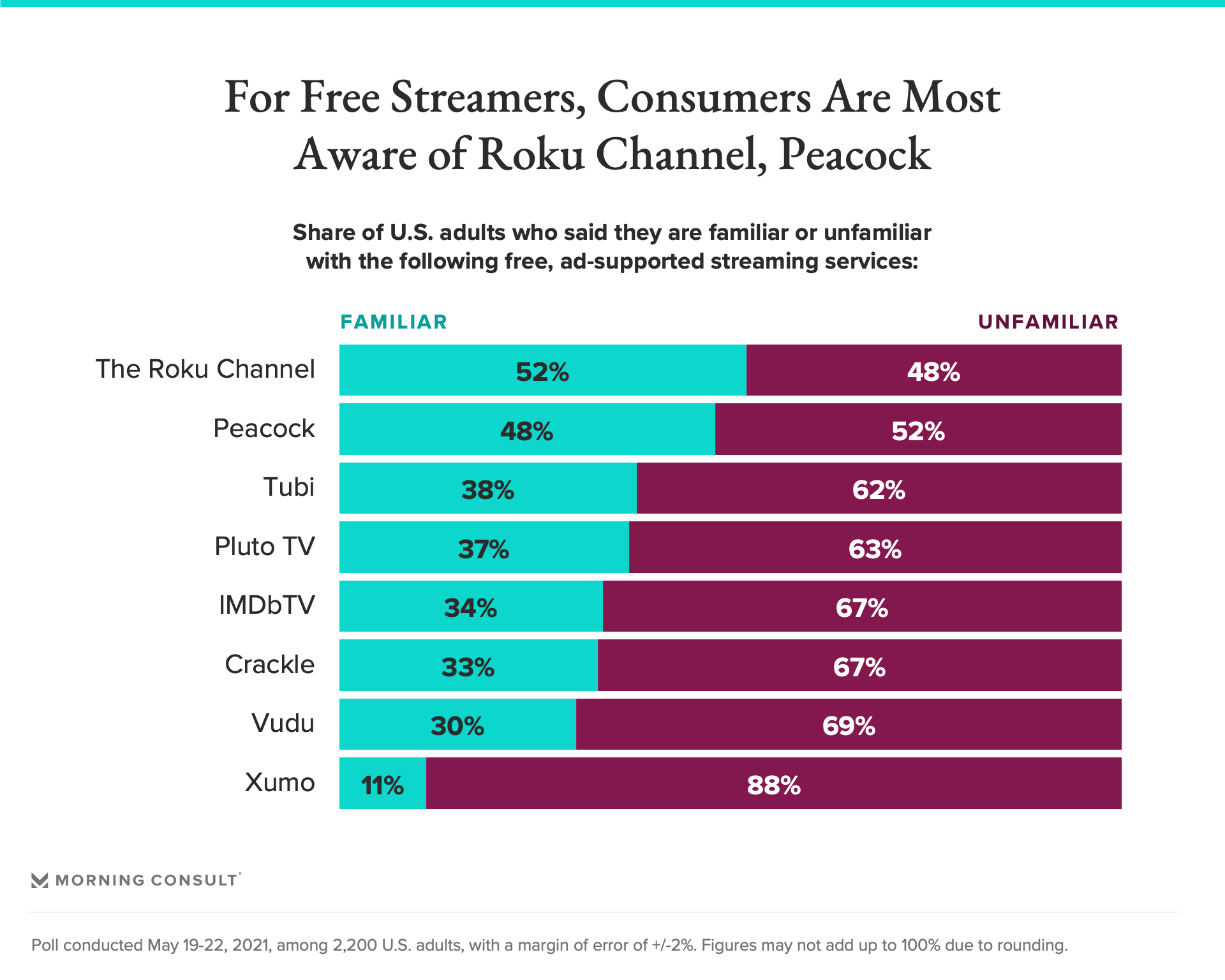 - Of the AVOD streamers included in the survey, consumers were most familiar with the Roku Channel (52%) and the free version of Peacock (48%).