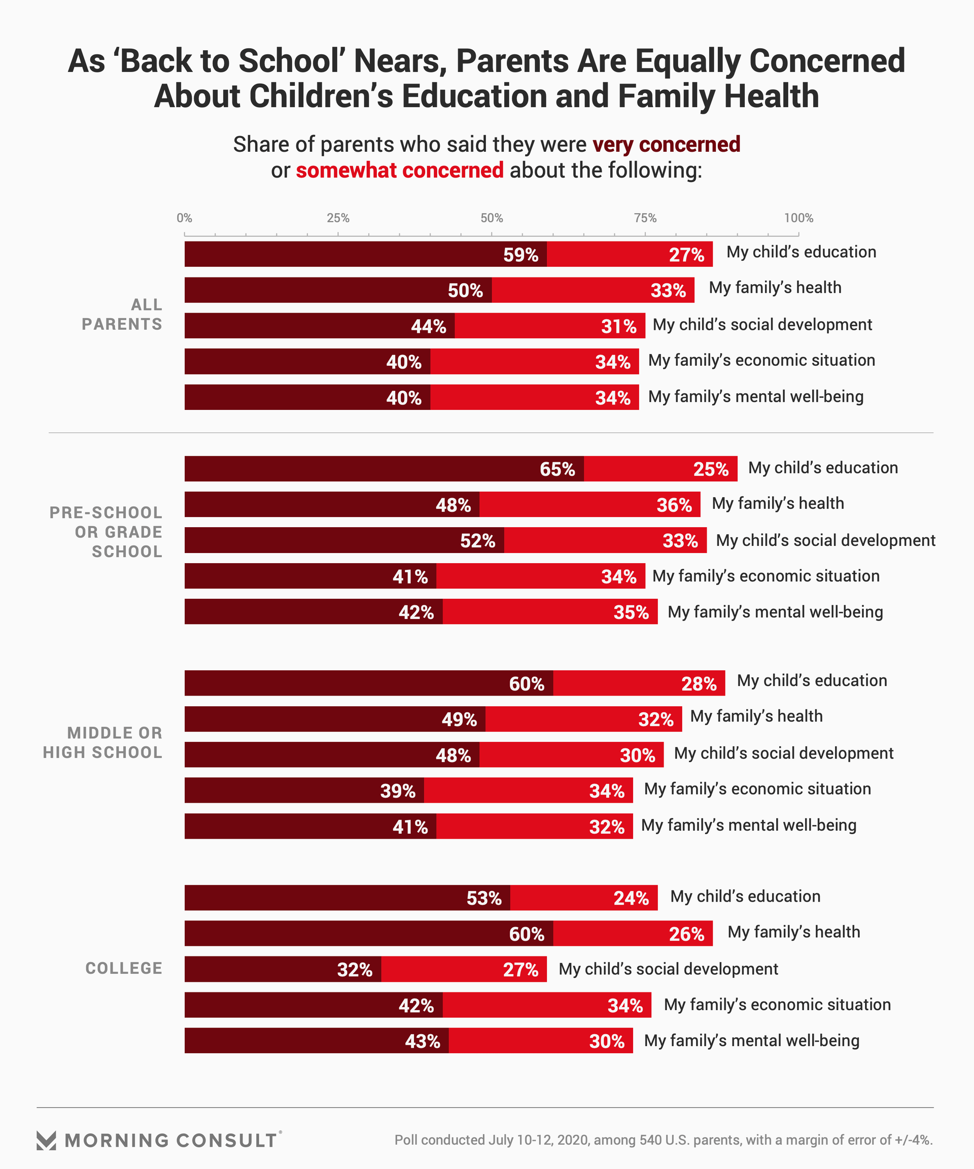Parents expressed relatively equal concern about their children’s education and their family’s health, although they were slightly more likely to say they were “very” concerned about the educational element (59 percent vs. 50 percent).