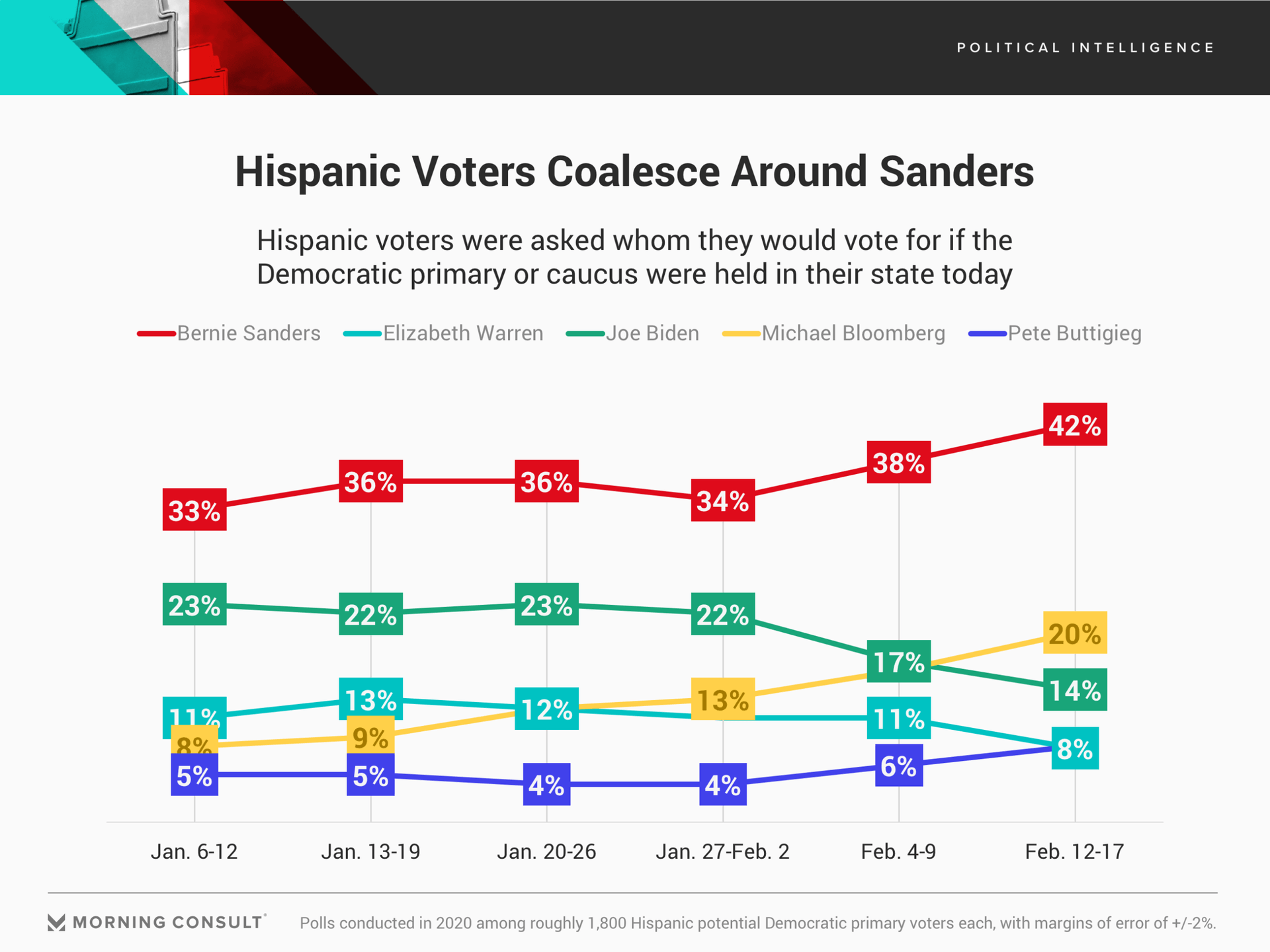 As the party’s nominating contest turns toward the more diverse terrain of Nevada, which has a significant Latino population, Morning Consult polling finds Sanders gaining with Democratic primary voters who identify as Hispanic. He is the first choice for 42 percent of those voters, up 9 percentage points since the beginning of the year and up 8 points since before the Feb. 3 Iowa caucuses. Those gains appear to be coming mostly at the expense of Biden, who is down to 14 percent from 23 percent in early January.
