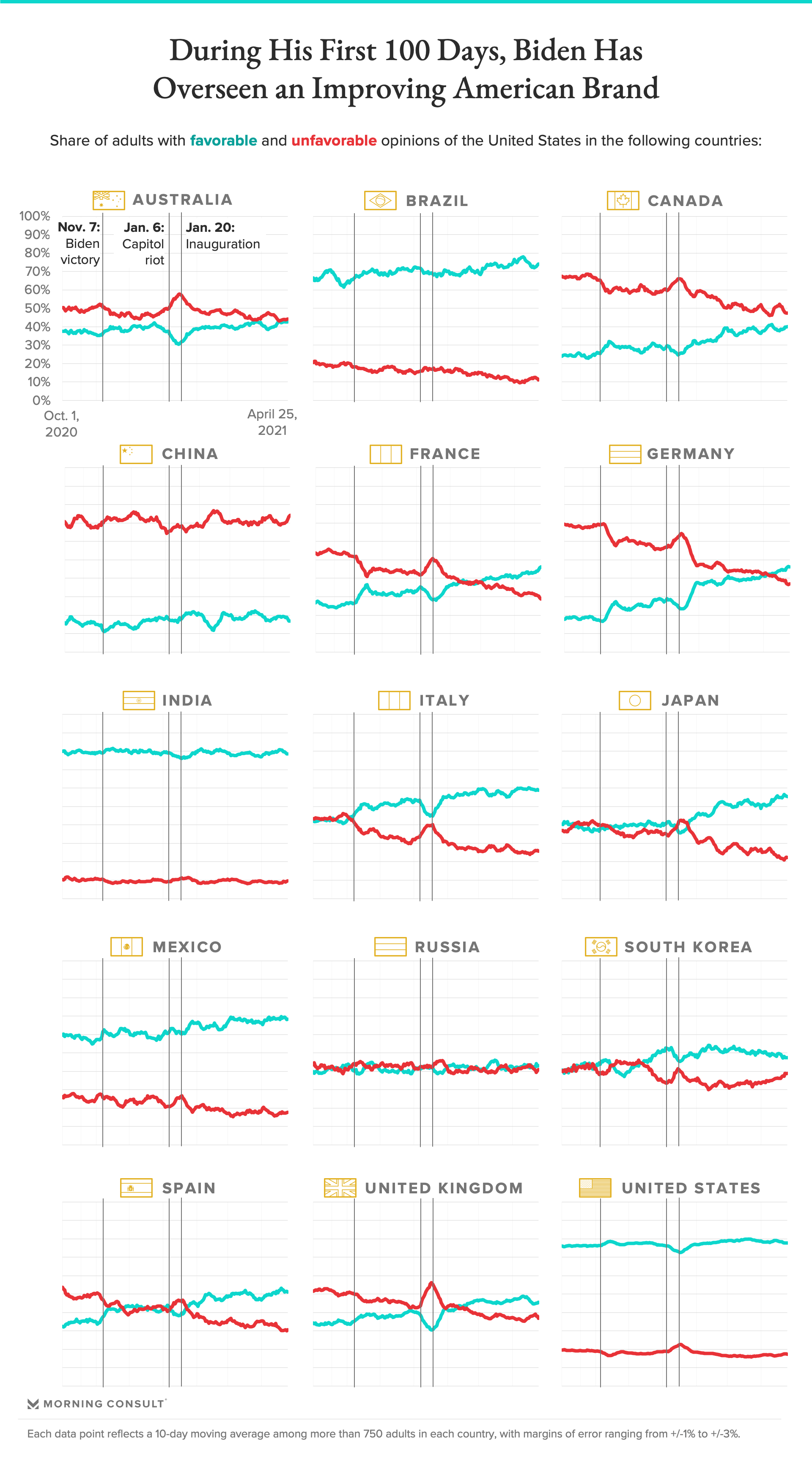 Nearly 100 days later as the United States and the world meets a symbolic milestone of Biden’s presidency, the Oval Office’s current occupant is overseeing a sizable improvement to the American brand across many allied countries, according to Morning Consult Political Intelligence tracking of global sentiment.