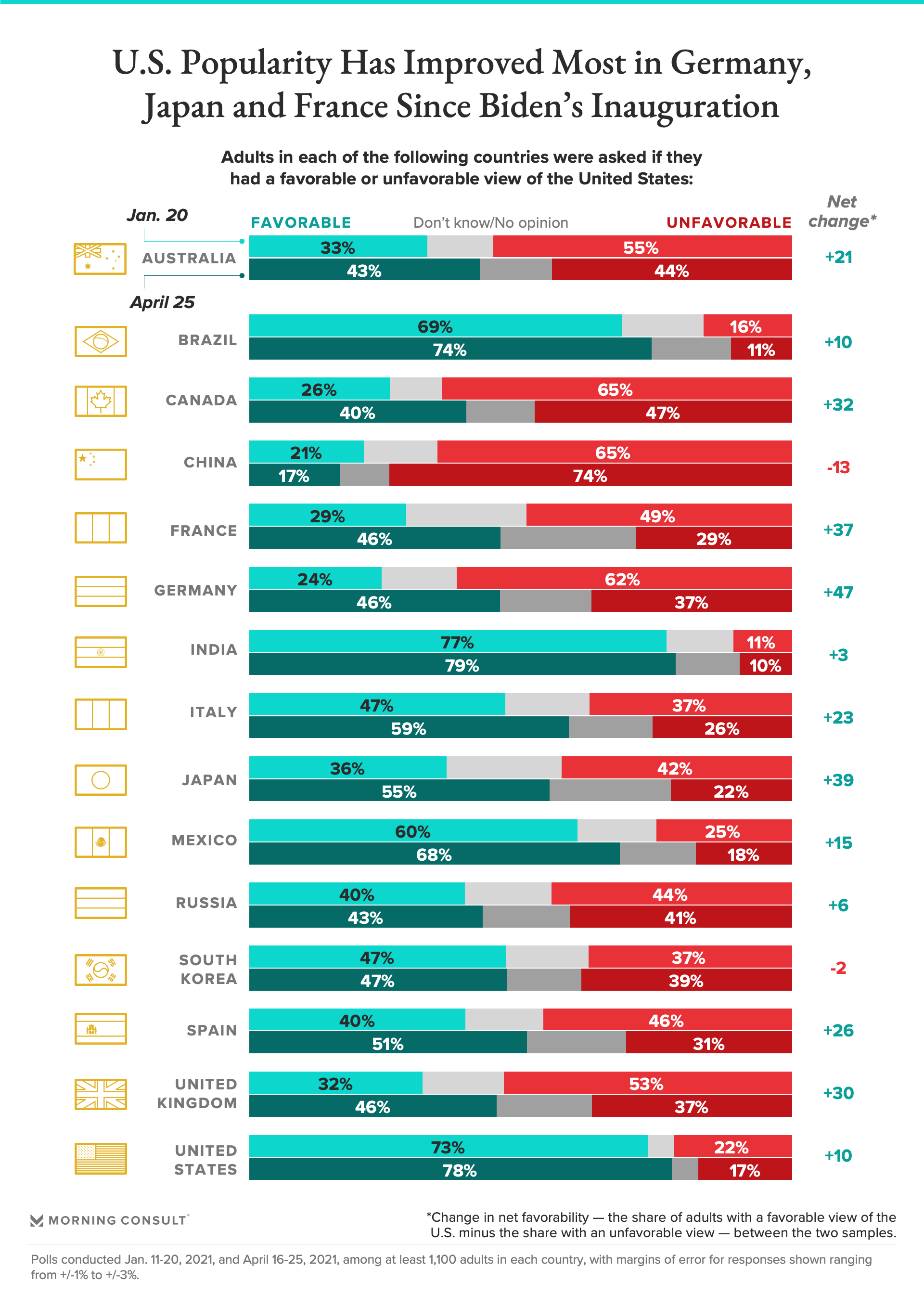 The latest surveys of adults in 14 other nations found that favorable views rose by an average of 9 points since Biden’s inauguration, with the largest improvement in international sentiment about the United States over the past three months occurring in Germany. Since Jan. 20, America’s favorability rating increased 22 percentage points in the country, with 46 percent of Germans now holding favorable views and 37 percent holding unfavorable views, down 25 points.