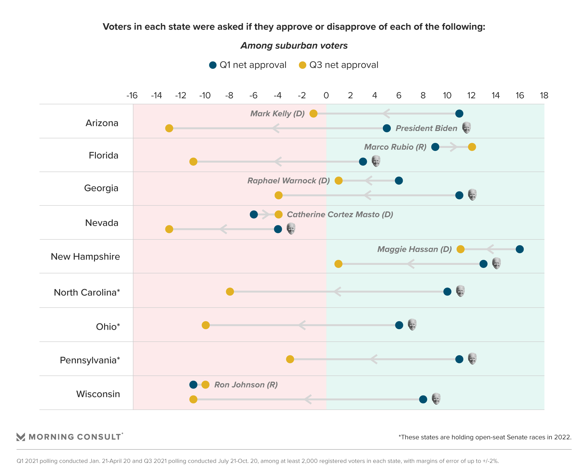 - Declining suburban sentiment for Biden hasn’t weighed down vulnerable Senate Democrats to the same extent — except Mark Kelly of Arizona.