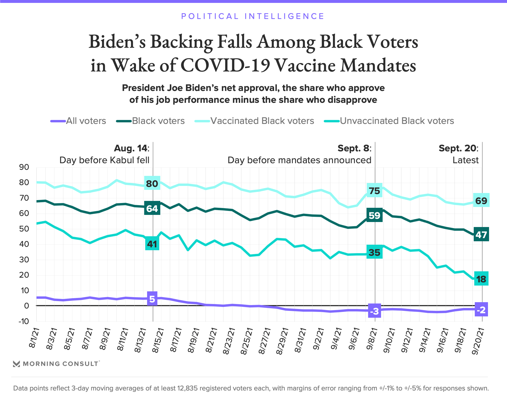 Biden’s net approval rating among unvaccinated Black voters has plummeted 17 points since before the rollout of the mandates.
