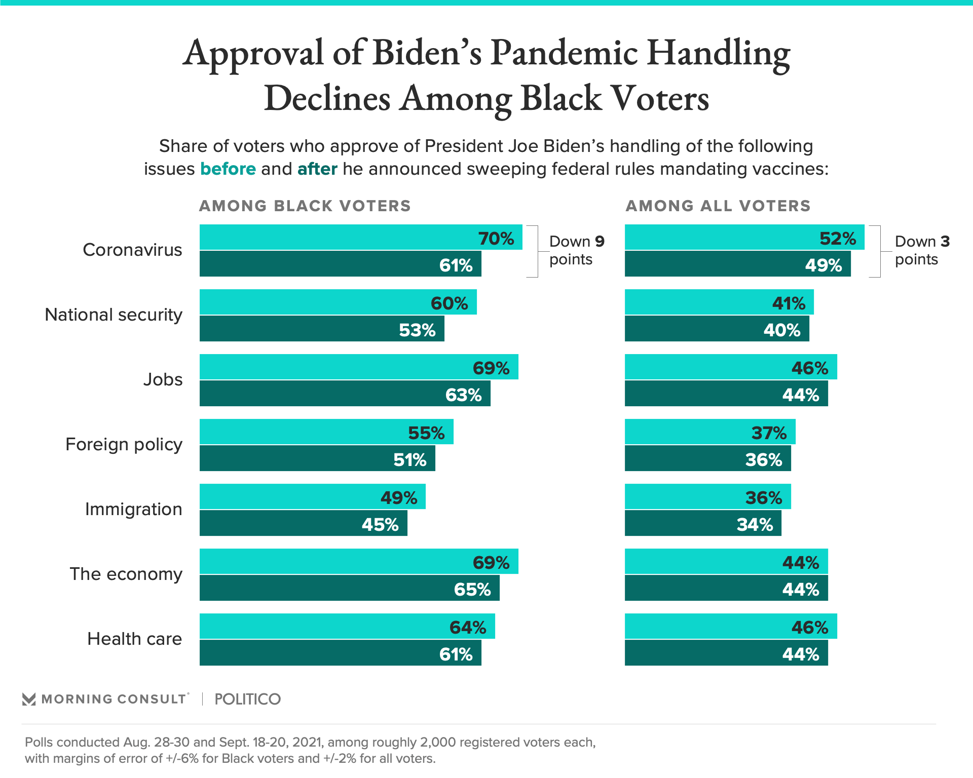 71% of Black voters approve of Biden’s job performance, down 5 points since the federal vaccine mandate, while the share who disapprove rose 7 points to 24%.