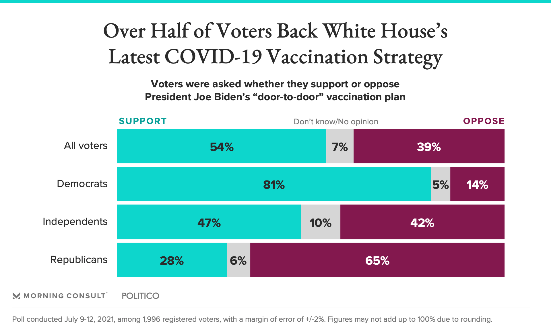 As the COVID-19 vaccination drive dwindles, new Morning Consult/Politico polling indicates the White House’s latest strategy to pick up the pace through door-to-door campaigning may fall flat with tens of millions of vaccine holdouts.