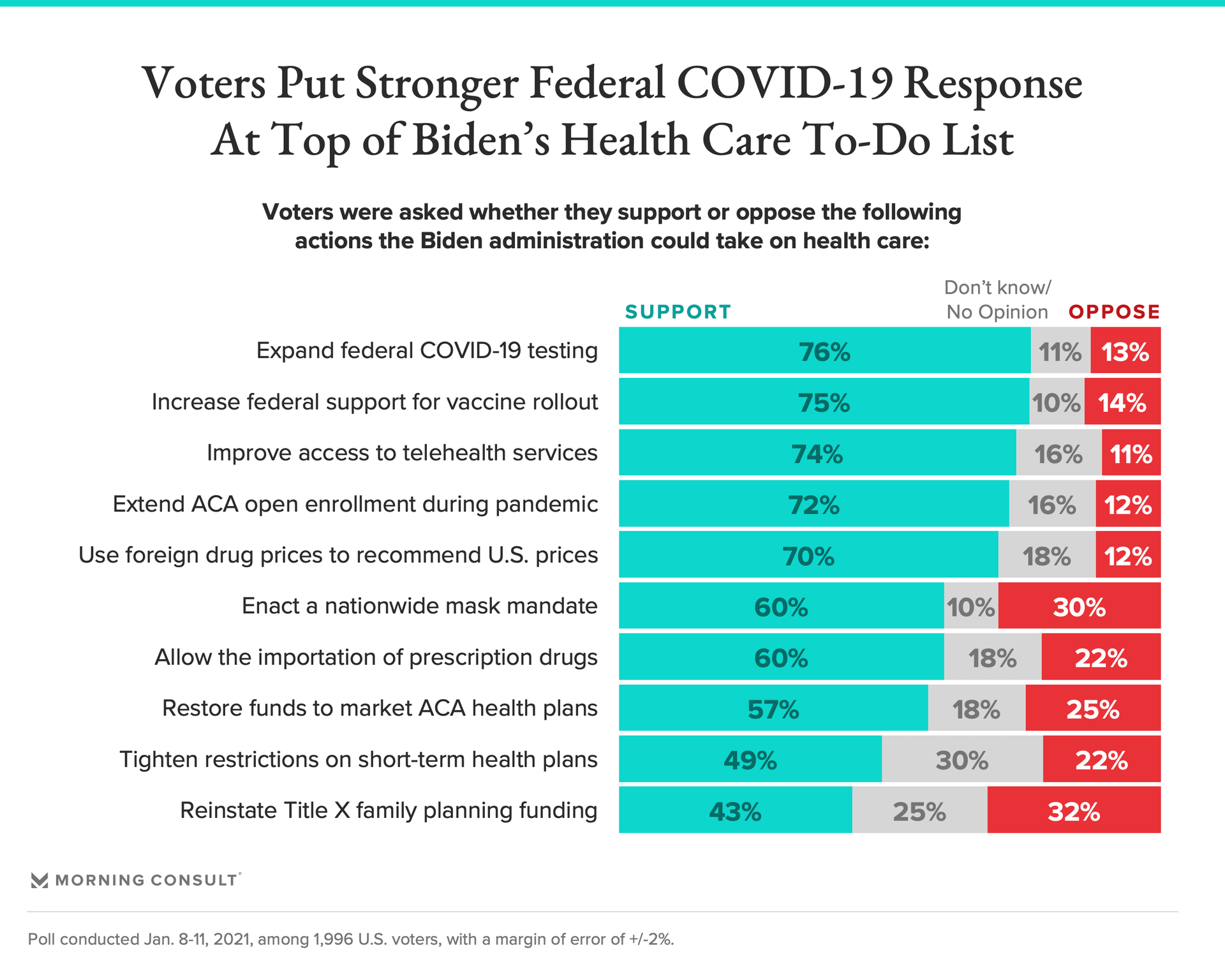 75% of voters support expanding federal support for COVID-19 vaccinations, while 76% support expanded testing.