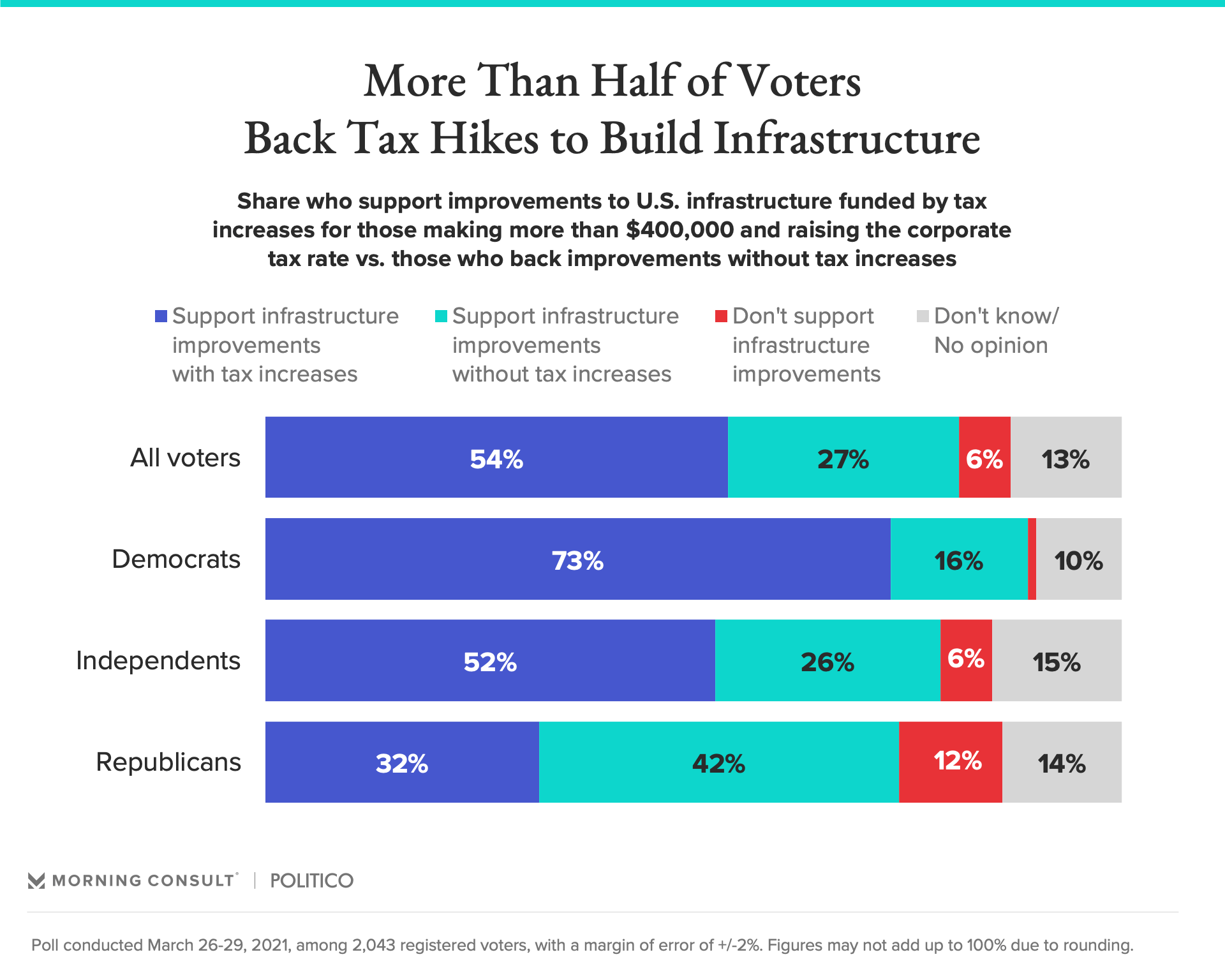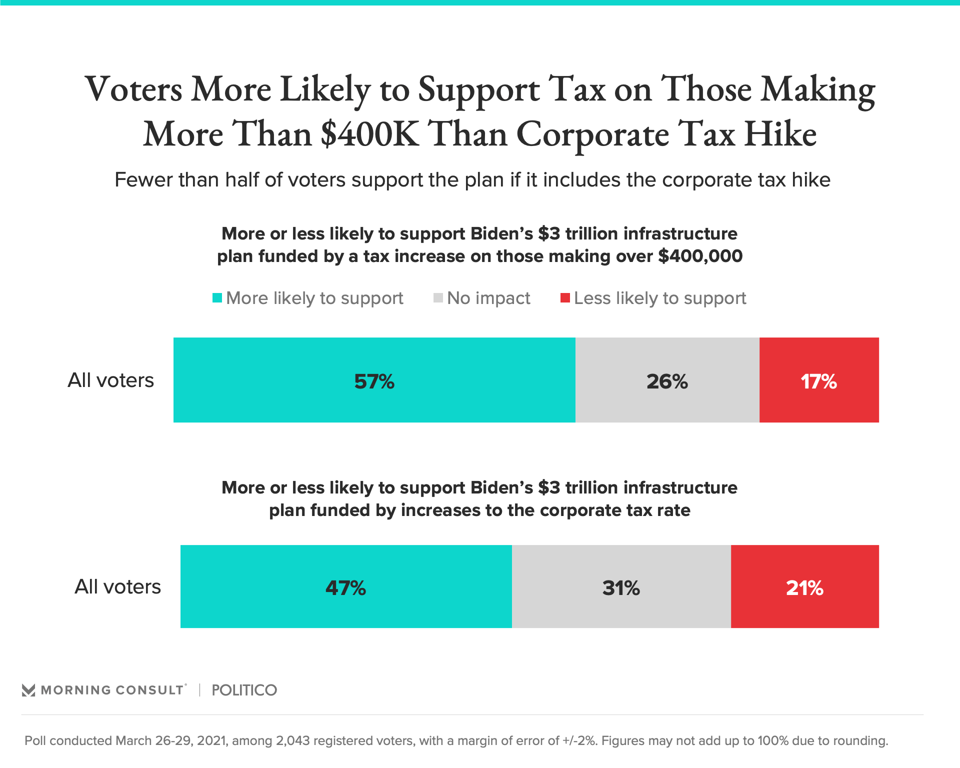57% of voters say they’d be more likely to support Biden’s infrastructure plan if it were funded by tax increases on those making over $400,000.