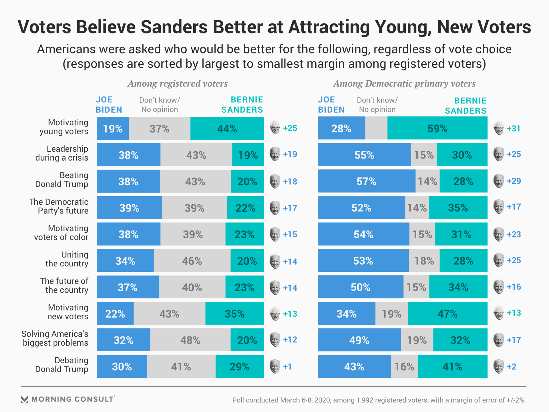 Setting policy aside, voters also tended to think a Biden presidency would add more value to the country and to the Democratic Party, and that he would be a better foil for Trump. Sanders was overwhelmingly seen as a better candidate to help with a major concern for the party: bringing new or young voters to the polling booths. The youngest voters (ages 18-29) made up 19 percent of the voting bloc in the 2016 presidential election, per exit polling, with 55 percent voting for Democratic nominee Hillary Clinton.