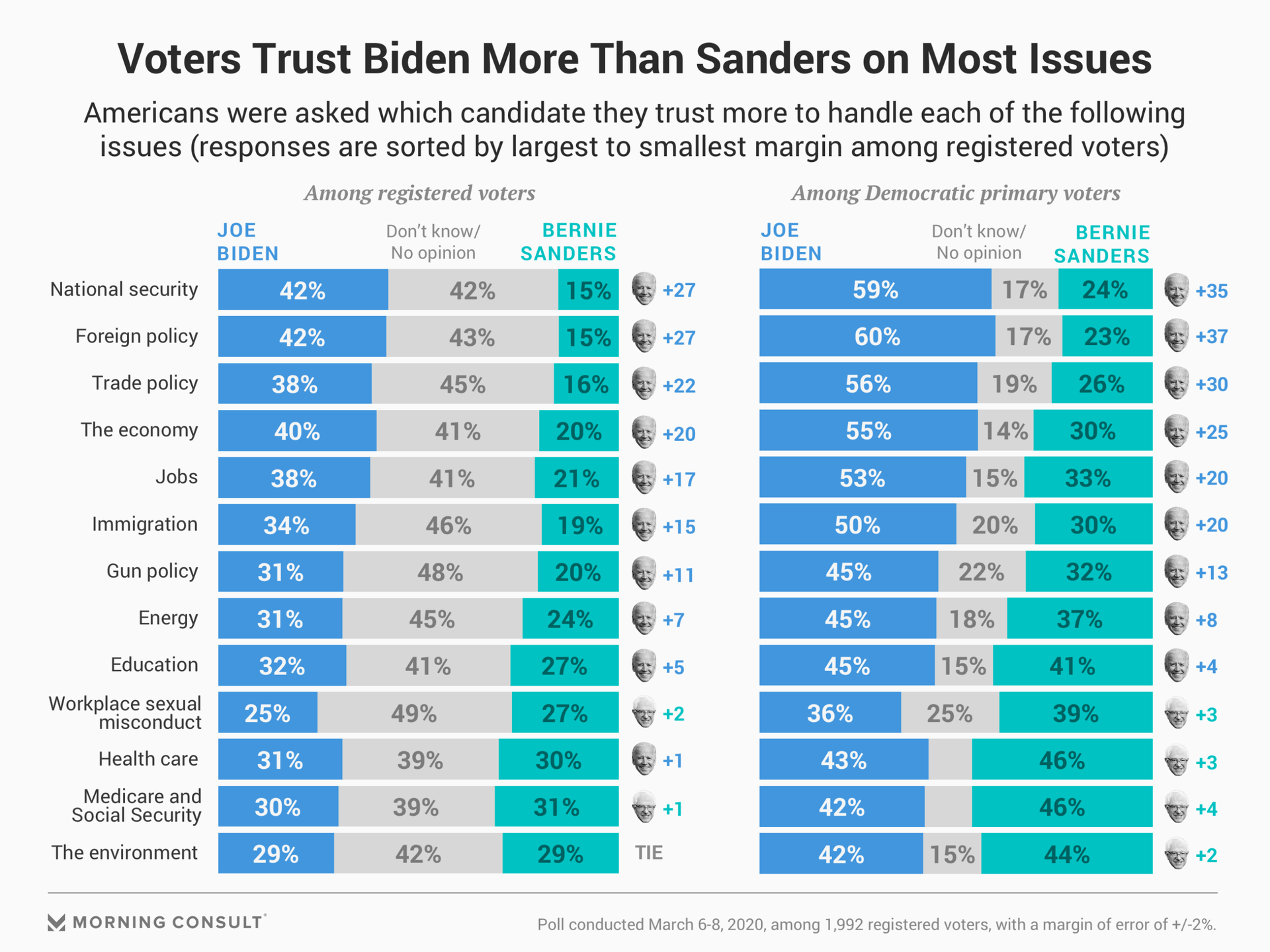 Democratic primary voters and the broader electorate also trust Biden over Sanders, by double-digit margins, to handle issues such as the economy and immigration, according to a Morning Consult/Politico survey conducted March 6-8. That survey was conducted among 1,992 registered voters and has a 2-point margin of error.