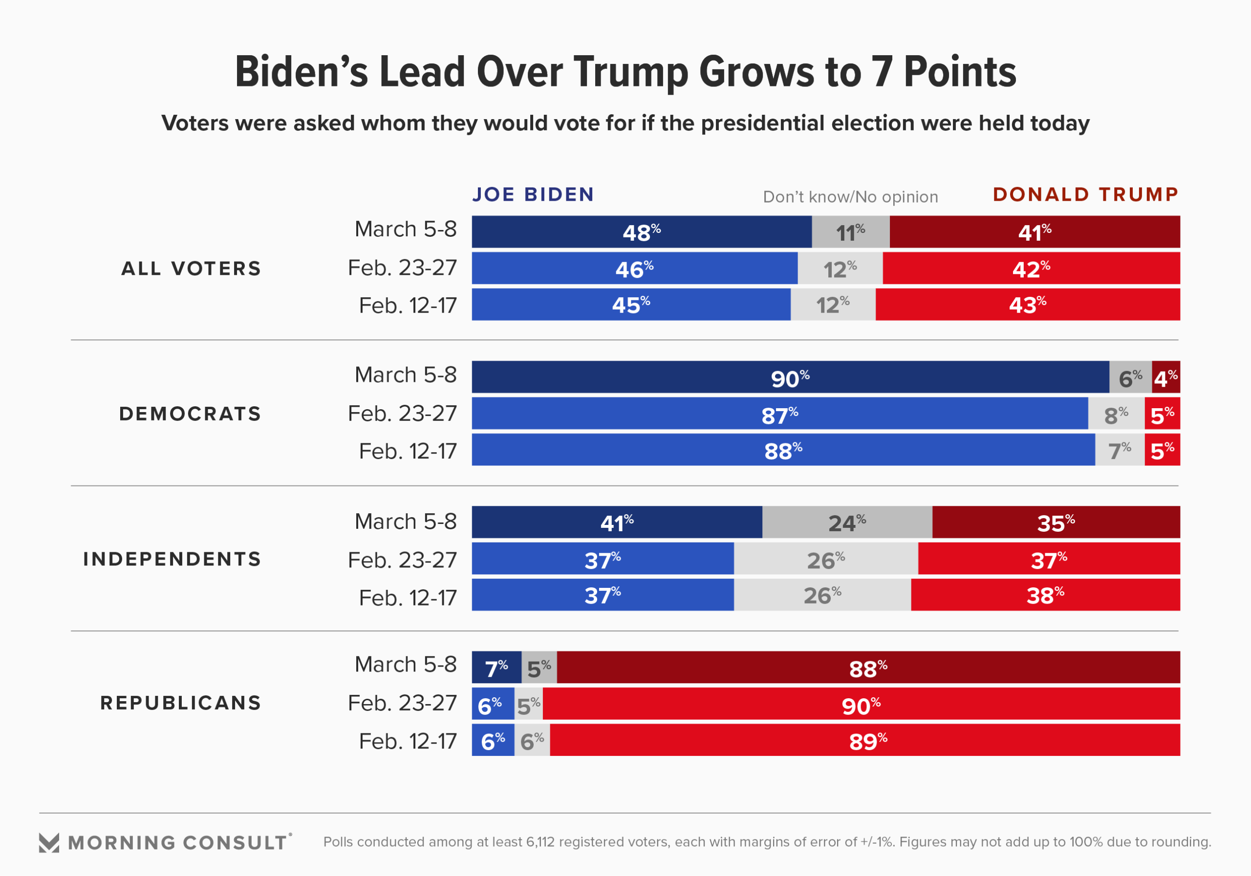Biden’s edge over Trump in hypothetical general-election matchups has swelled to 7 percentage points, the largest margin measured by Morning Consult in 2020. For the first time in several weeks, the former vice president performs better against the president than Sen. Bernie Sanders (I-Vt.), who led Trump by 6 points, 47 percent to 41 percent.