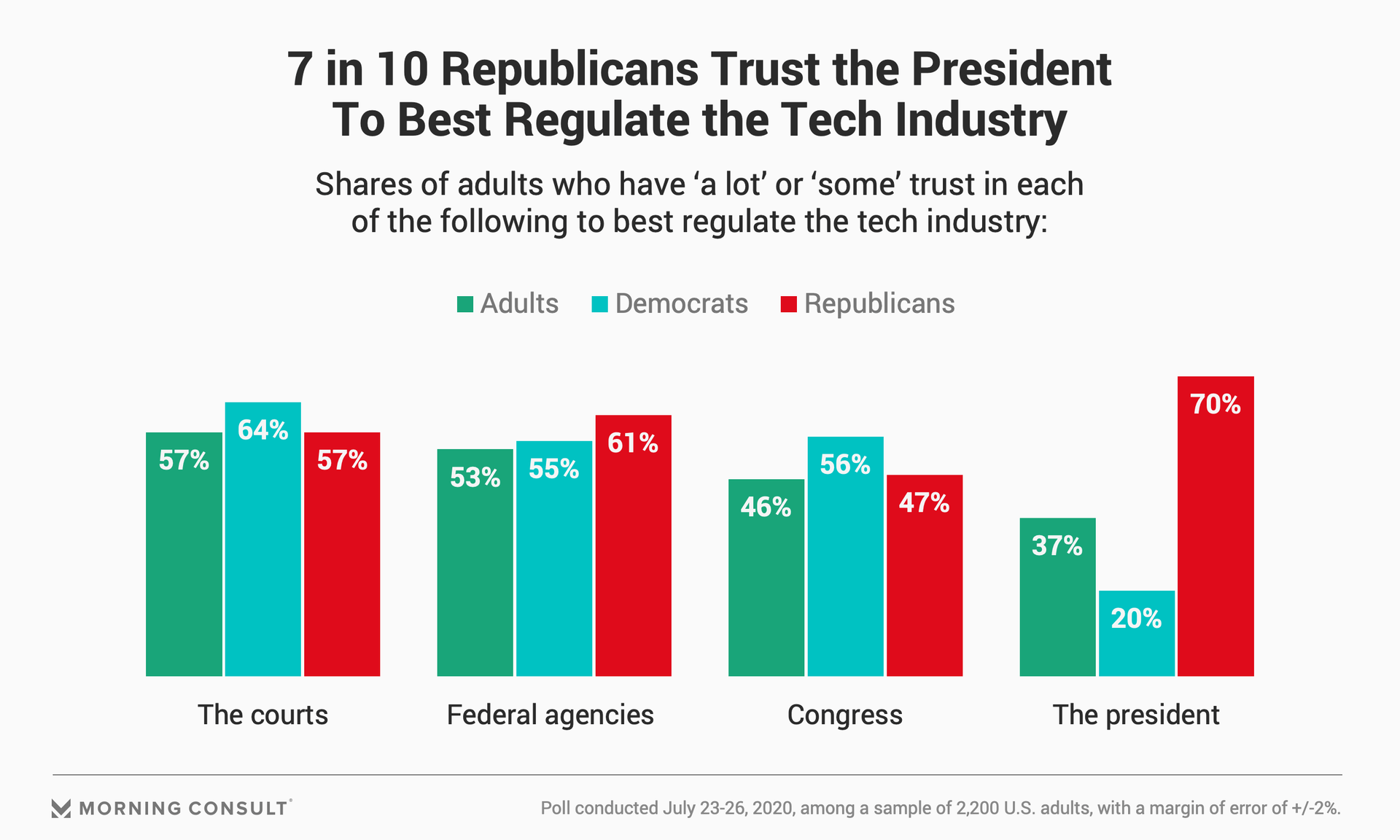 More than half (55 percent) of the 2,200 adults surveyed in a Morning Consult poll conducted July 23-26 said they believe Congress had “a lot” or “some” understanding of how to regulate the technology industry, but they were 9 percentage points less likely, at 46 percent, to trust the lawmakers best to do so. Adults, regardless of party affiliation, were more likely to trust other government institutions, such as the court system (57 percent) and federal agencies (53 percent), to best regulate the sector.