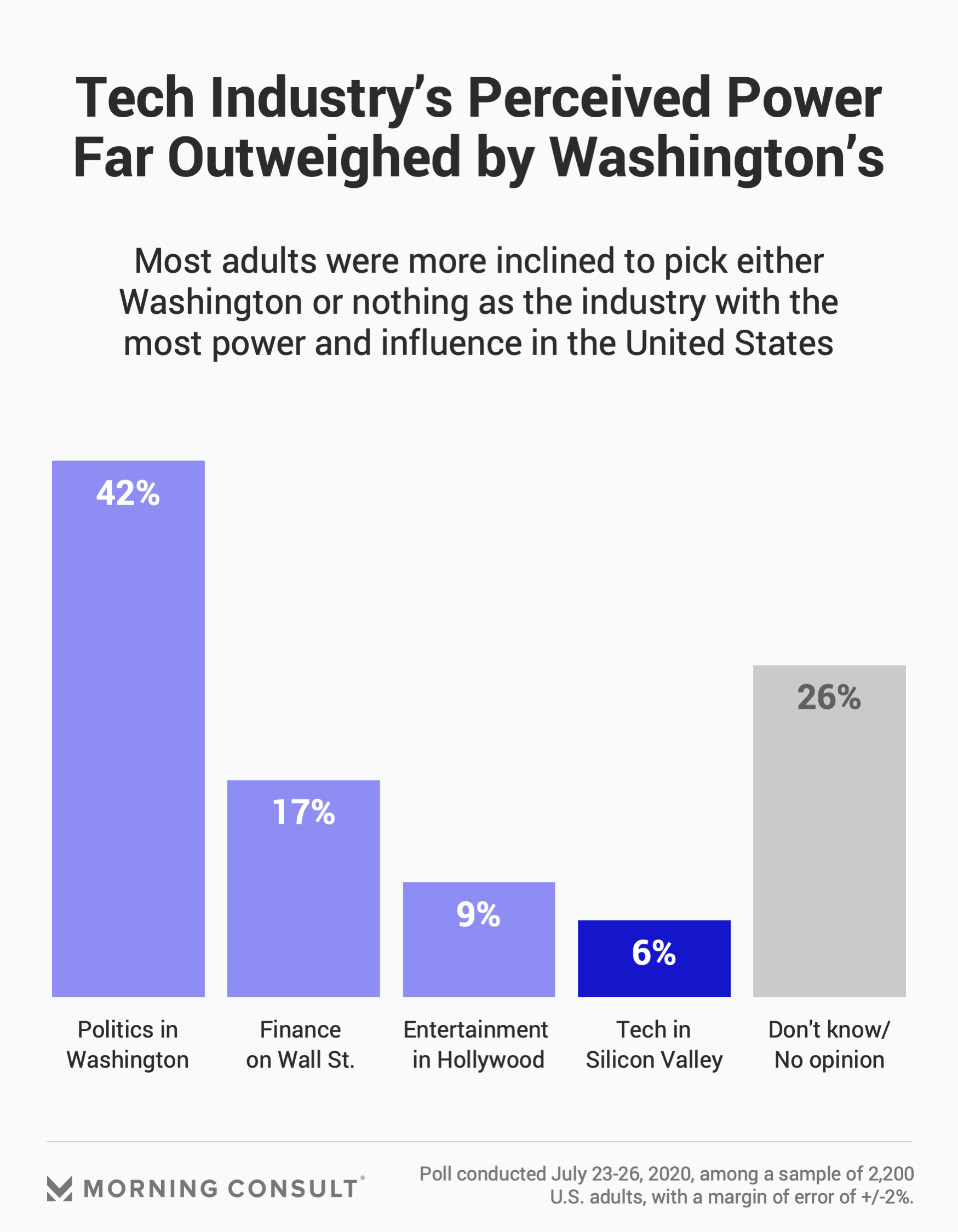 And that sense of uncertainty goes hand-in-hand with how U.S. adults view the amount of power the tech industry has. When asked to choose which industry holds the most power and influence in America, technology in Silicon Valley ranked last: 6 percent picked tech, compared to 42 percent who chose politics in Washington. The share who picked the tech industry is statistically unchanged since the first time the question was asked in a February 2018 survey.