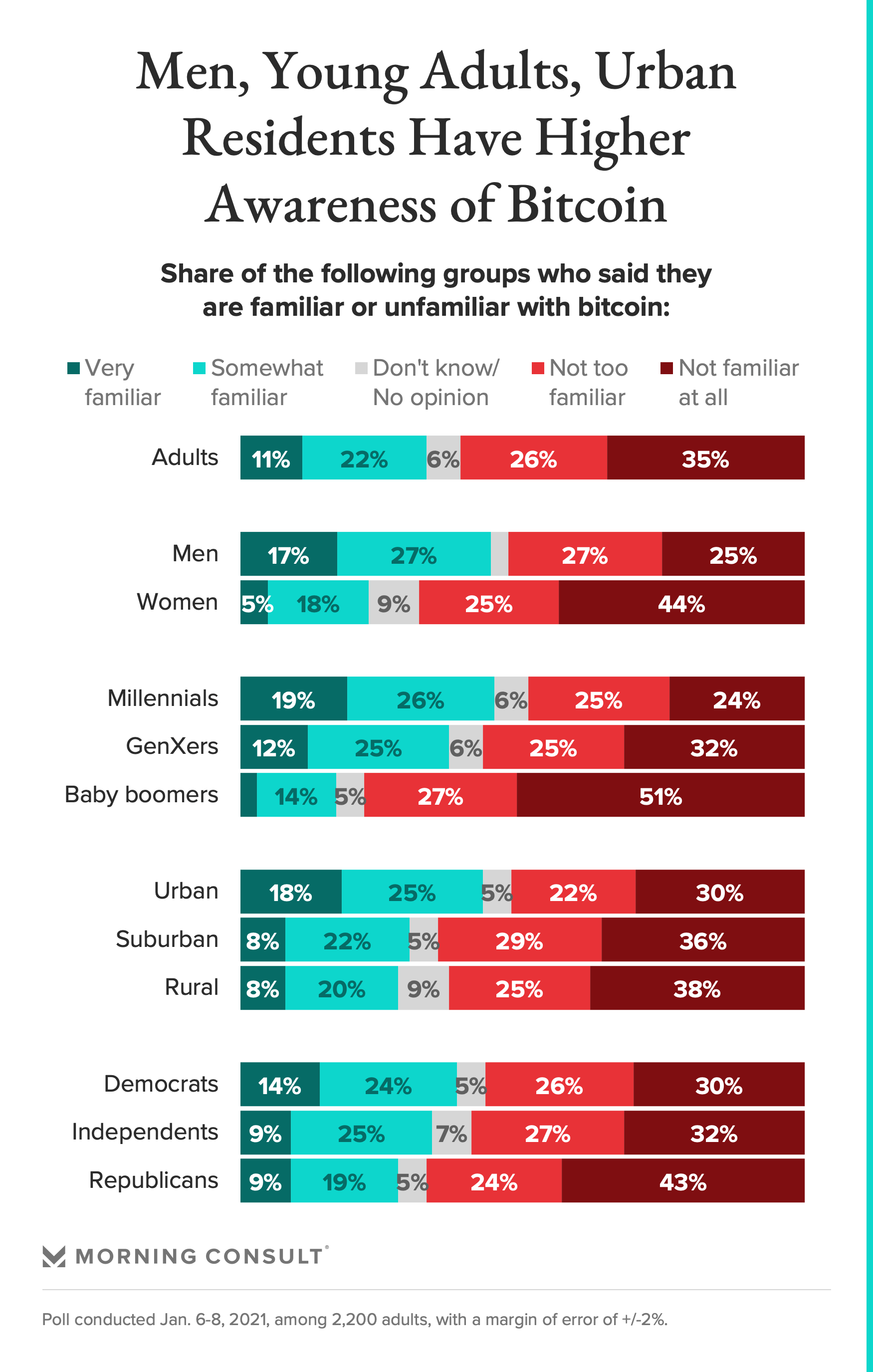 So far, at least, bitcoin hasn't established itself as a great equalizer in an unbalanced financial system: Men, young adults and urban residents are more likely than women, older Americans and those living in suburban and rural communities to be familiar with the cryptocurrency, according to new Morning Consult data.