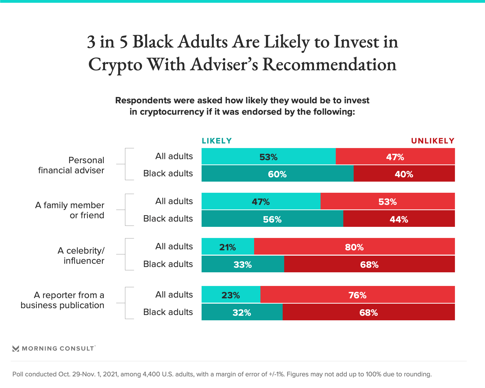 While Black adults are more likely to say they’d invest in crypto based on an endorsement from a celebrity or an influencer, they’re also 9 percentage points more likely than adults overall to say they’d act on such a recommendation from a family member or friend, according to Morning Consult’s poll.