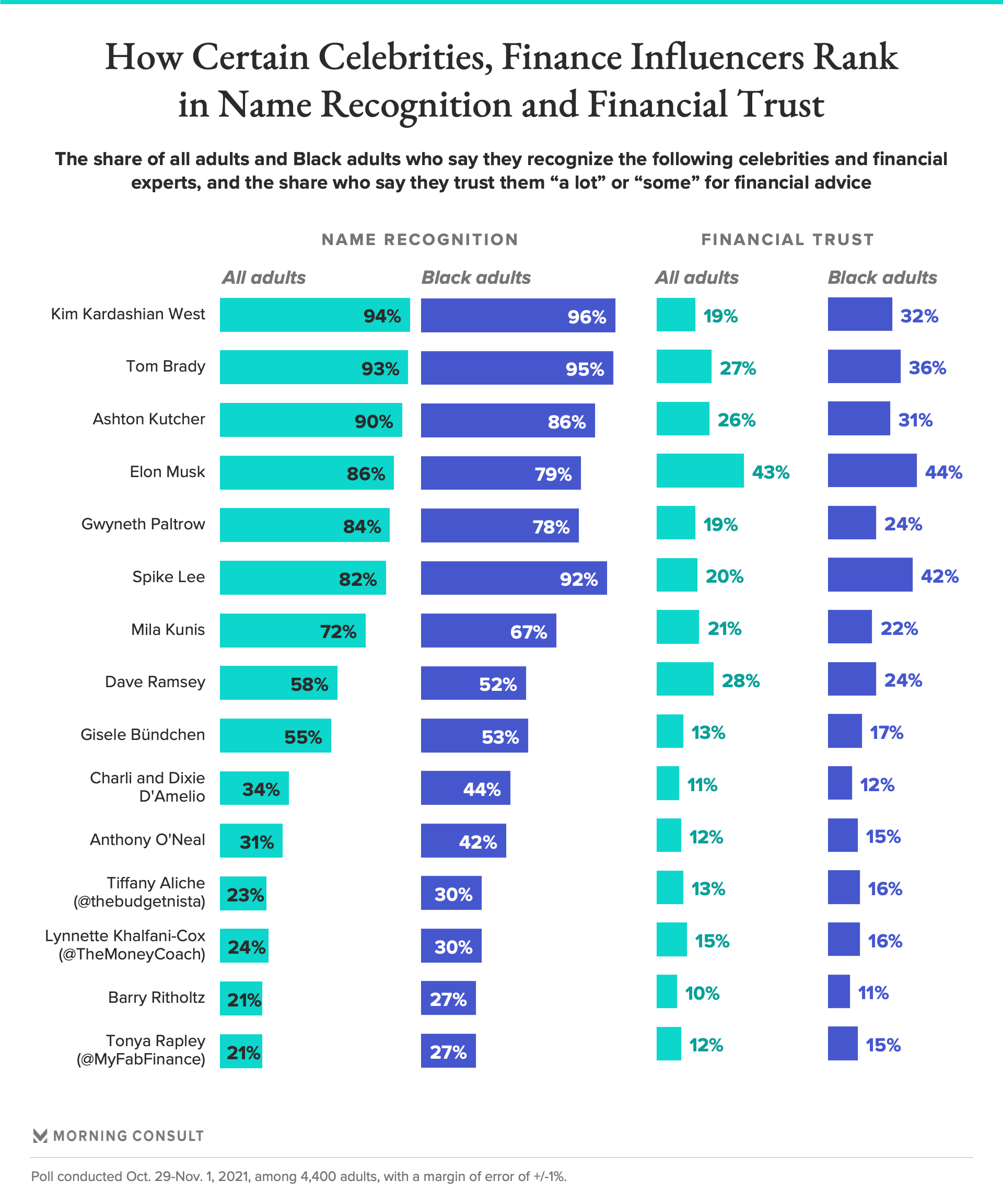 Among the list of celebrities and influencers who’ve talked about cryptocurrency, Kardashian West received the widest name recognition in the Morning Consult poll. Thirty-two percent of Black adults said they had “some” or “a lot” of trust in her financial advice, while 19 percent of all adults said the same.