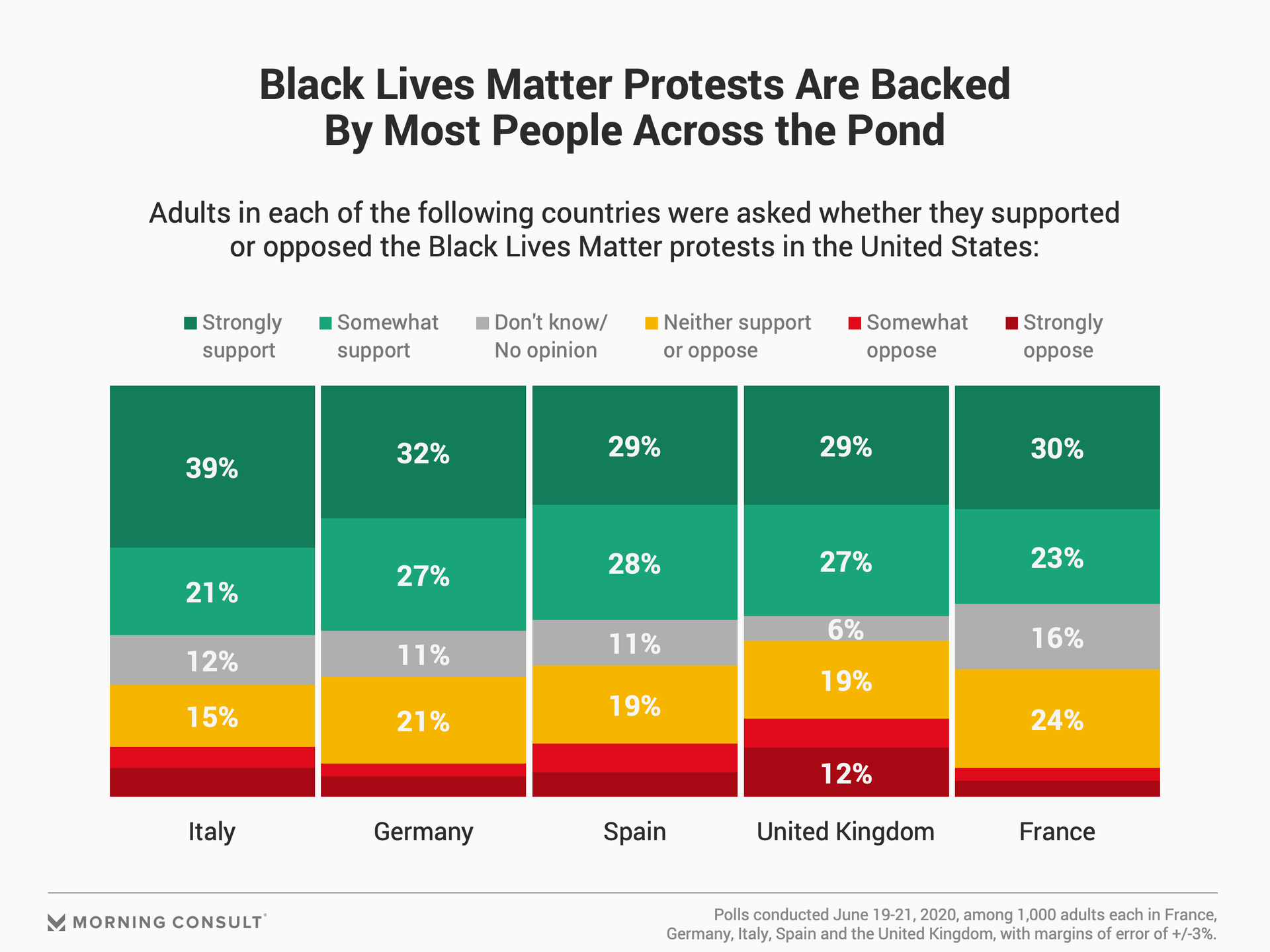The U.S. public's enduring support for the Black Lives Matter protests sparked by the killing of George Floyd in Minneapolis police custody last month is matched by sentiment in Western Europe, according to a new Morning Consult poll.