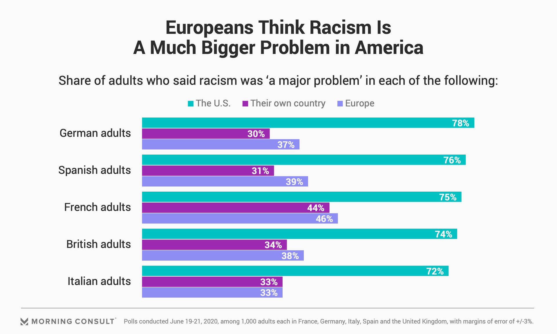 But while social unrest in America is prompting some introspection among European countries on their own handling of racial and socioeconomic issues at home, those polled were far less likely to say that they had a similar crisis on their hands.