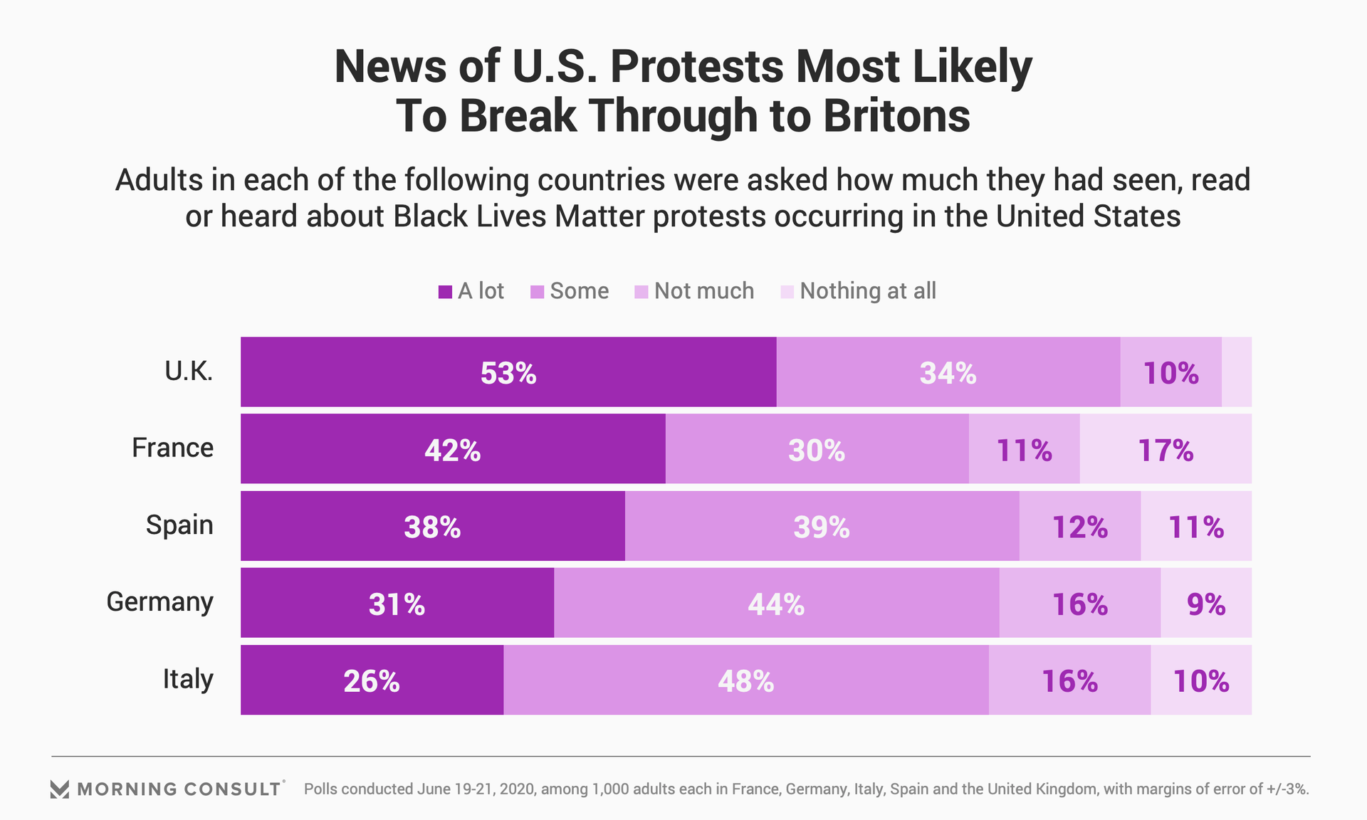 The protests have become an international phenomenon, with people all over the world taking to the streets to call attention to perceived injustices within their own communities. News and discussion of the U.S. demonstrations pierced the British consciousness in particular, according to the poll: 53 percent of Britons said they’d heard “a lot” about the Black Lives Matter protests, significantly more than those living in other parts of Europe.