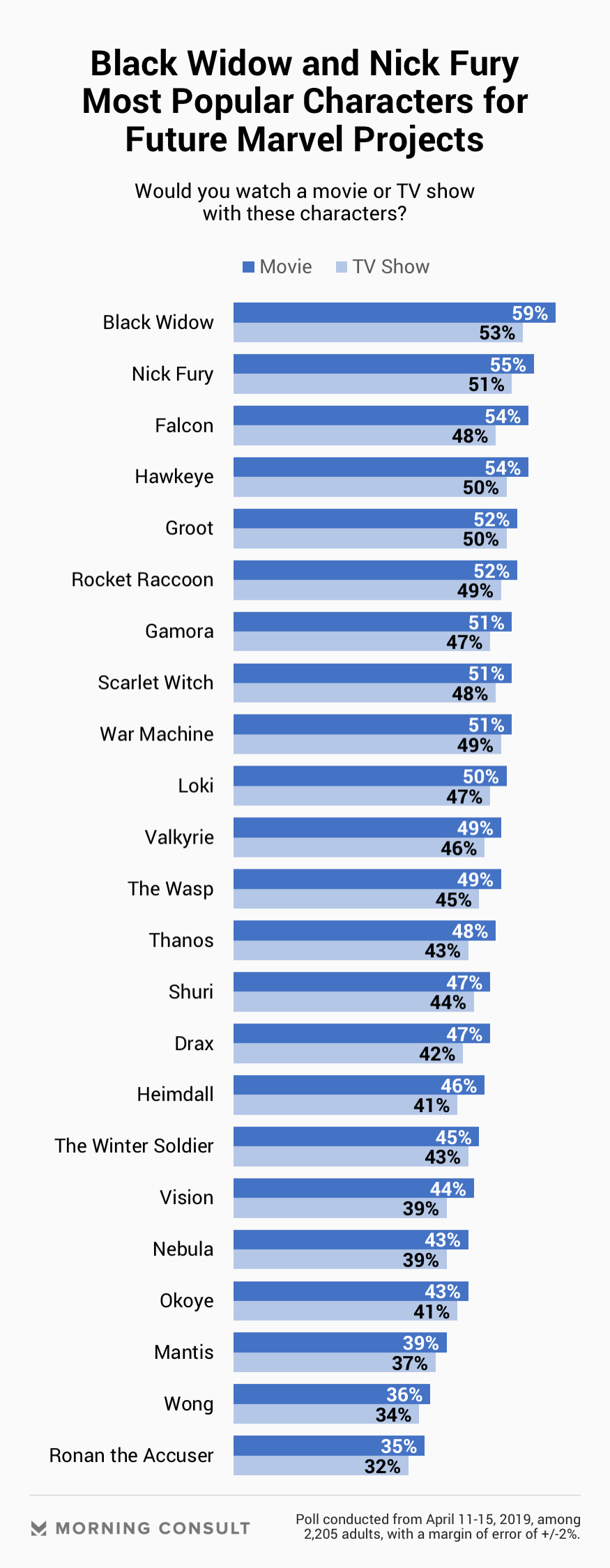 The April 11-15 Morning Consult/The Hollywood Reporter poll found Scarlett Johansson’s Black Widow and Samuel L. Jackson’s Nick Fury were the most popular characters for potential spinoff films and television shows. The poll’s margin of error is 2 percentage points.