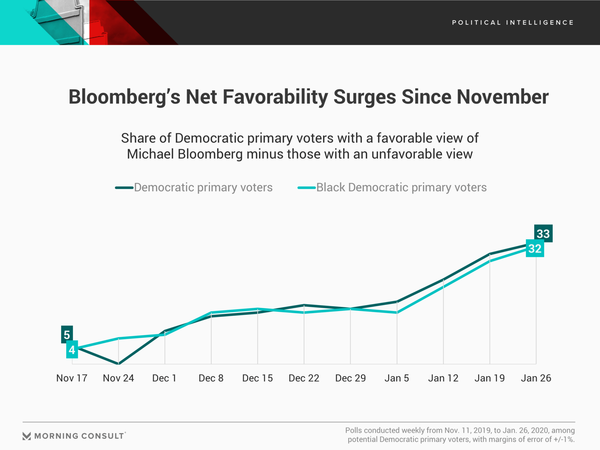 As Bloomberg grows his nationwide vote share, Democratic primary voters are seeing him in a more favorable light. Upon entering the race in November, Bloomberg’s net favorability (or the share of voters with favorable views minus those with unfavorable views) was just +5 among Democratic primary voters and +4 among black voters. In the latest poll, he was at +33 among all Democratic primary voters and +32 among black voters.