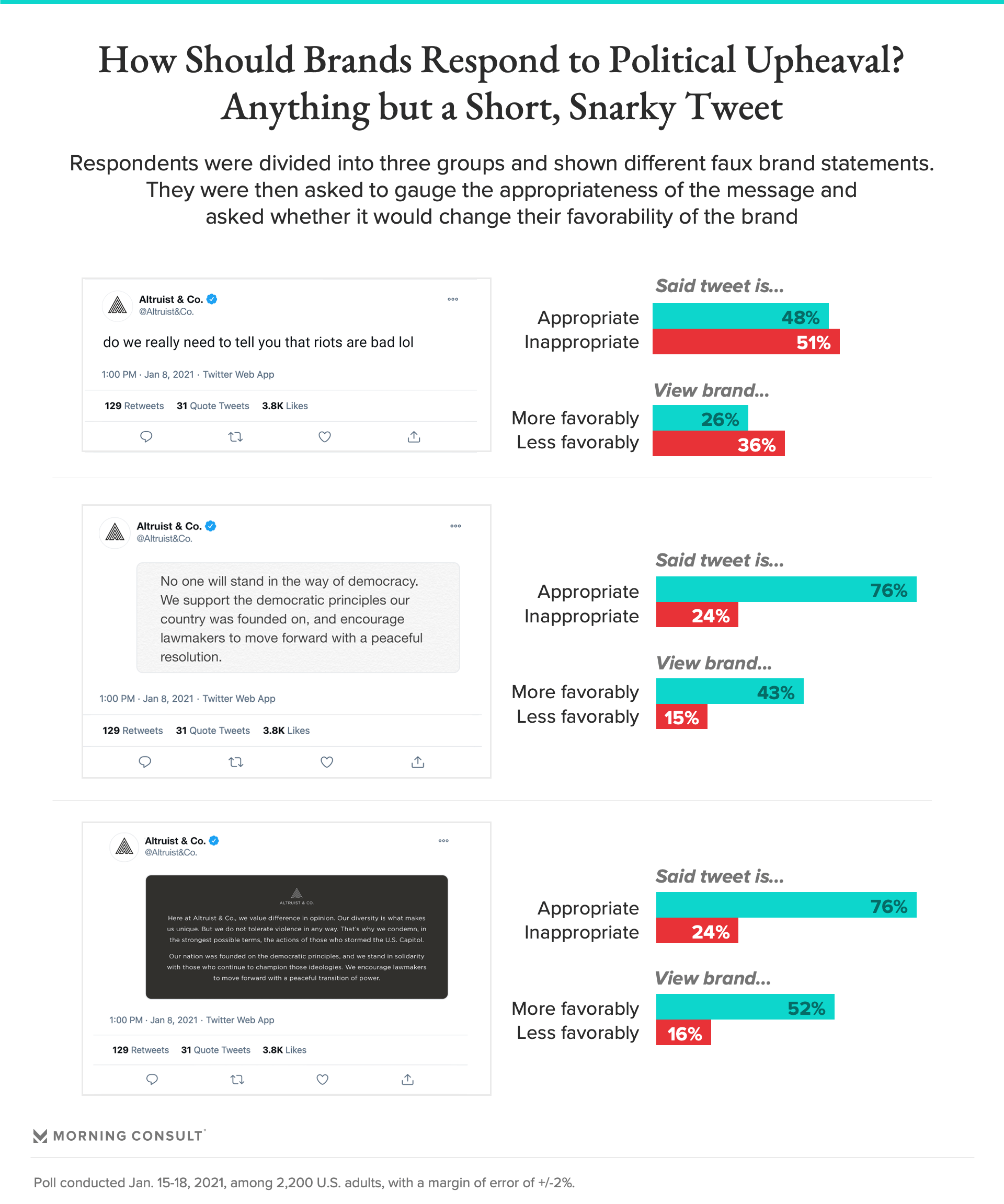 After the riot at the U.S. Capitol earlier this month came a flood of tweets, posts and statements from some of the country's biggest brands, condemning the violence and calling for peace. While brands risk alienation by staying silent on political and social justice issues, new polling from Morning Consult shows what kind of statements would garner the best reaction from the public.