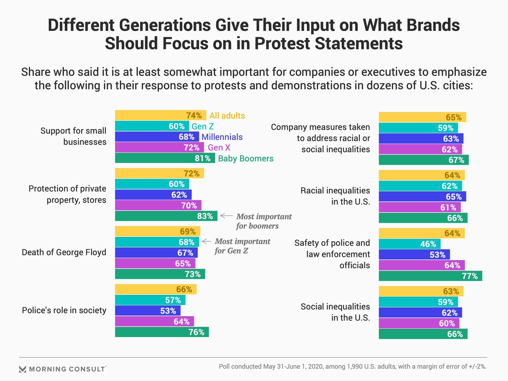 That sort of message makes the most impact among older generations: Eighty-three percent of Baby Boomers said they’d like to see companies mention the protection of private property, and 81 percent said companies should mention small-business support. Sixty percent of Gen Z adults said the same of each topic. To reach the youngest generation, the No. 1 thing the companies should emphasize is Floyd’s untimely death.