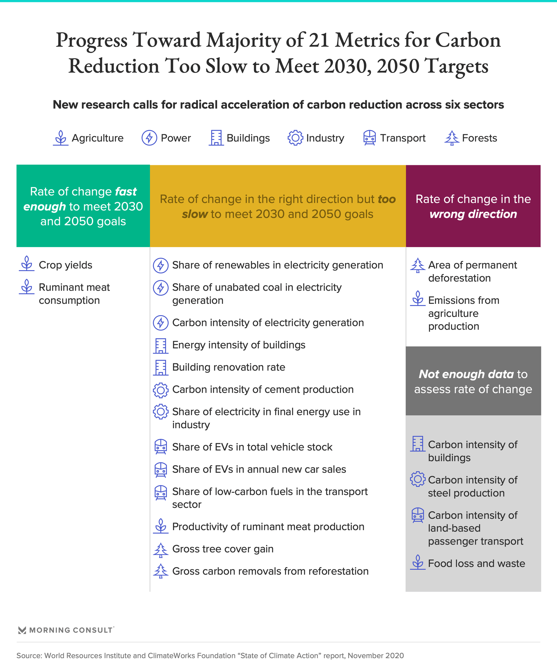Released Thursday by the World Resources Institute and ClimateWorks Foundation, the “State of Climate Action” report finds that the rate of progress in just two of these metrics — crop yields and ruminant meat (largely beef) consumption — has been fast enough historically to meet 2030 and 2050 carbon reduction goals.