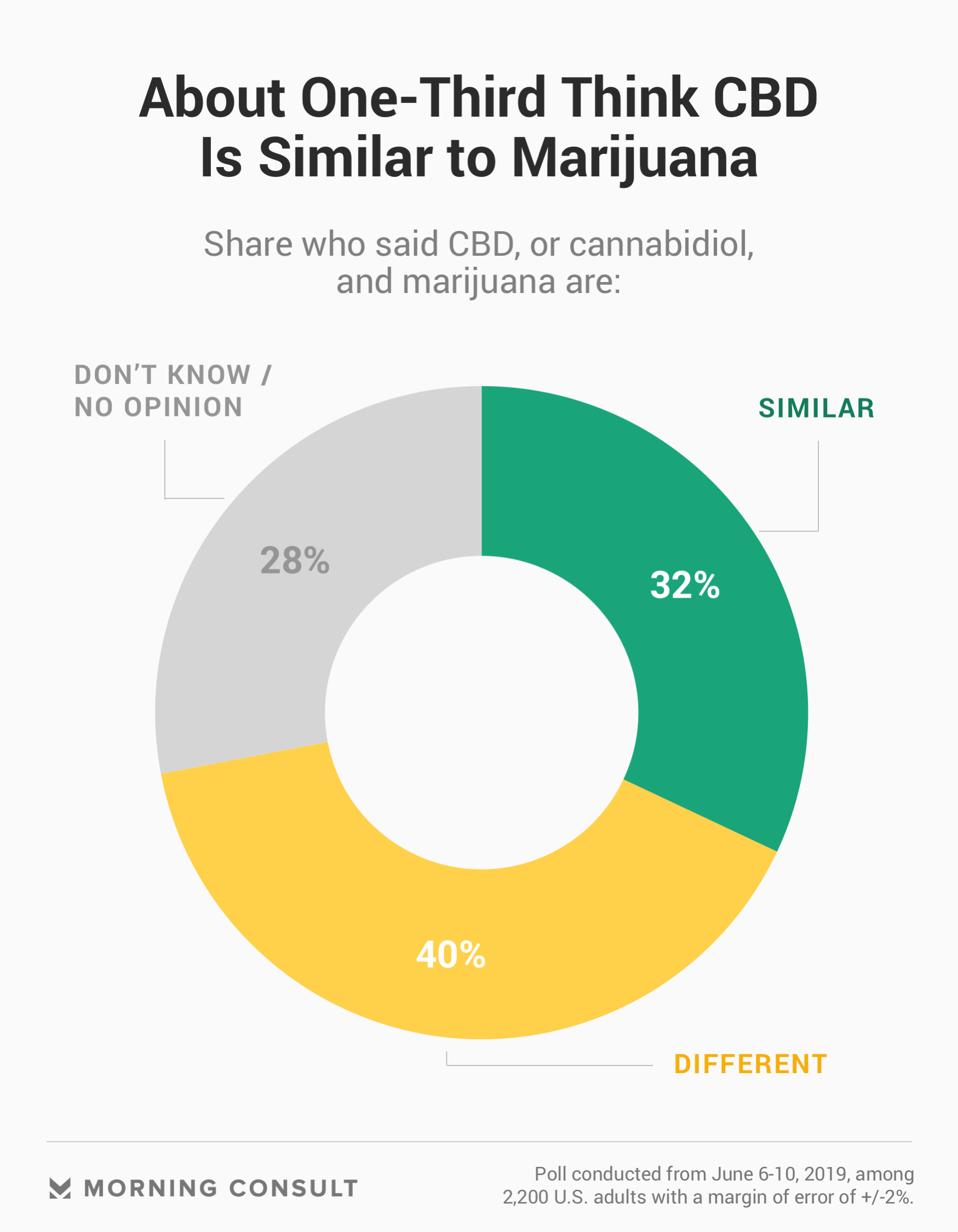 CBD has been touted as a miracle product, marketed to cure everything from anxiety to acne and sleep deprivation to menstrual cramps. But the hemp derivative suffers from a bit of a misconception issue, according to new Morning Consult polling. Nearly as many consumers (32 percent) said CBD is similar to marijuana as the number who understand that the two are different (40 percent). (The June 6-10 survey gauged attitudes of 2,200 U.S. adults and has a margin of error of 2 percentage points.)