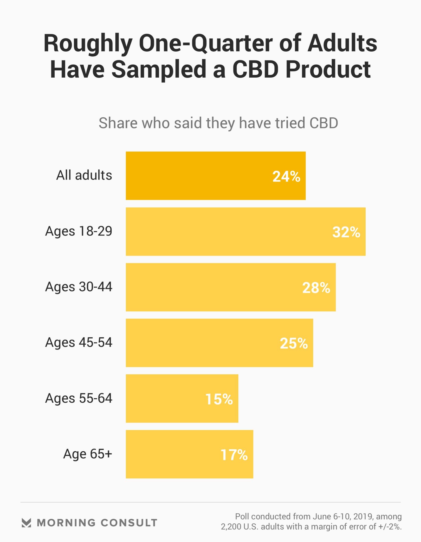 For a product that has legally been on the market for only six months, CBD has a fairly wide clientele: Roughly one-quarter (24 percent) of U.S. adults in the Morning Consult poll said they have tried it, a figure that stays the same, within statistical significance, regardless of one’s political party, political ideology, education or income. Young adults (ages 18-29) and Western residents are more likely to have tried cannabidiol.