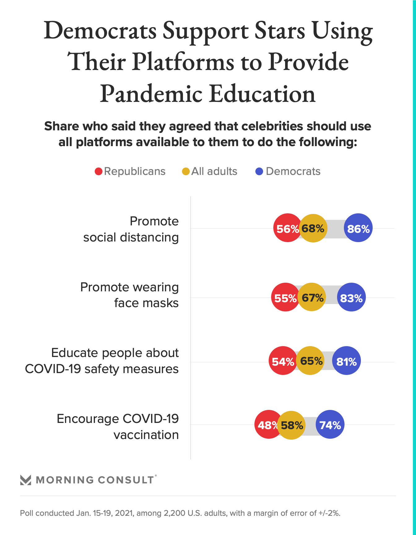 58% of respondents said that celebrities should use all platforms available to them to encourage the public to get vaccinated, a view shared by 48% of Republicans and 74% of Democrats.