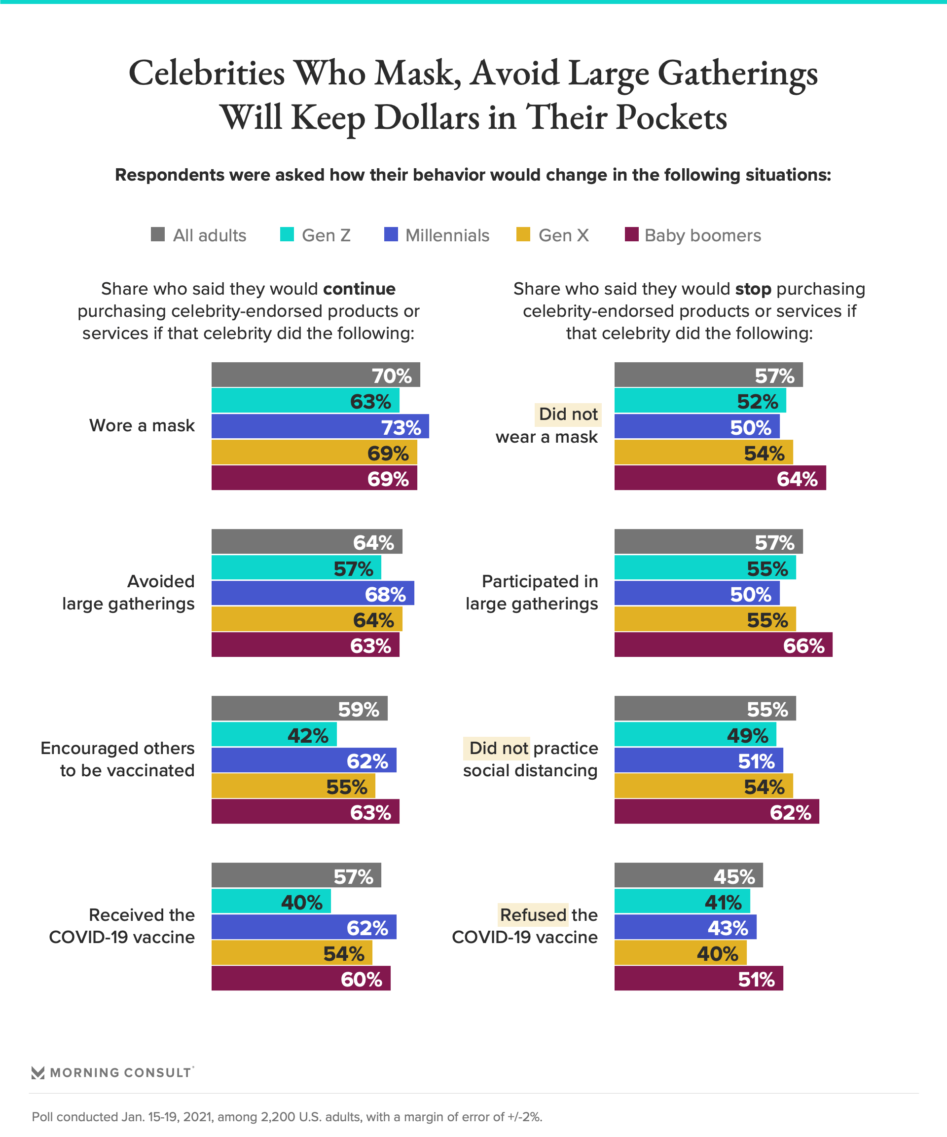 A Jan. 15-19 survey poised two hypotheticals to its 2,200 respondents — a celebrity following guidelines meant to prevent the spread of the coronavirus, and one choosing not to — and asked them how their views of the rich and famous would change as a result. Seventy percent of respondents said they would purchase products or services from celebrities who wore face masks in public, while 57 percent said they would opt not to purchase from a celebrity who did not wear a face covering in public.
