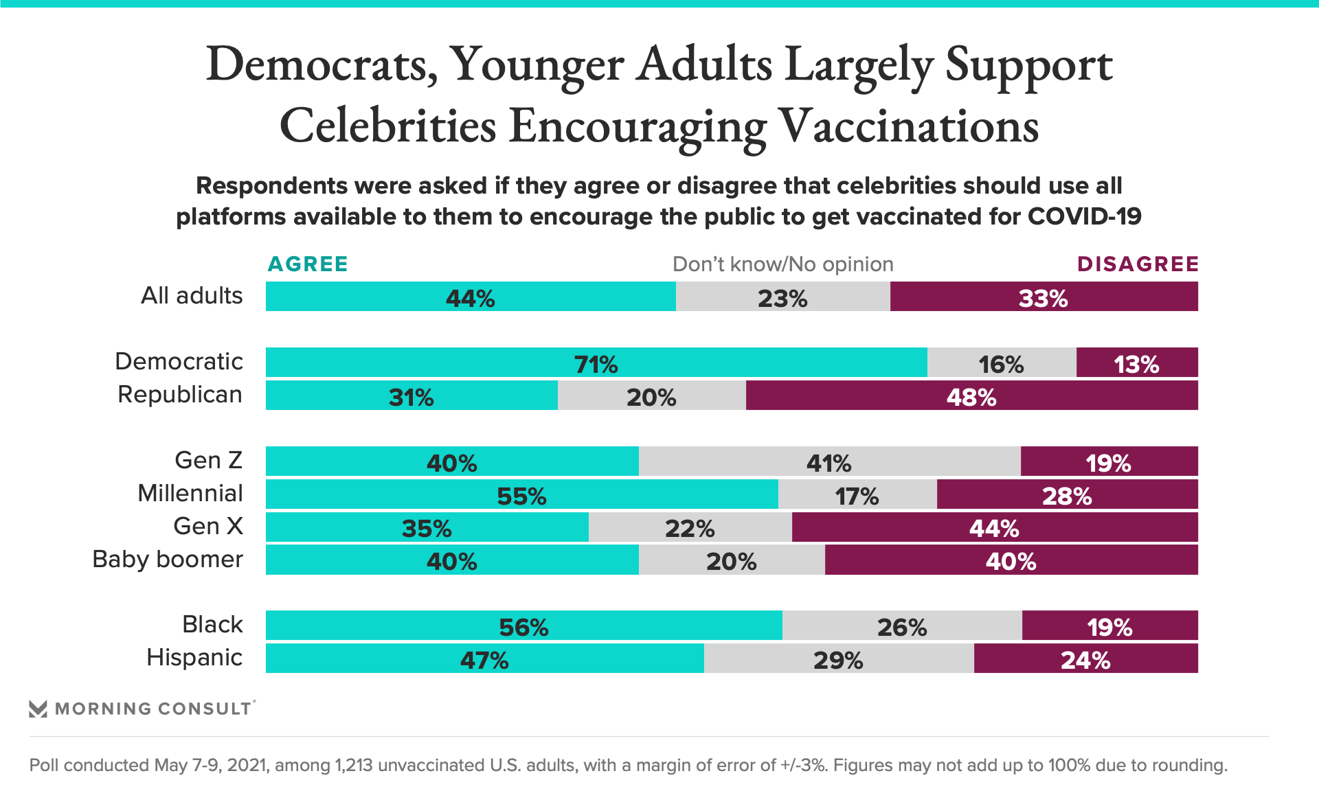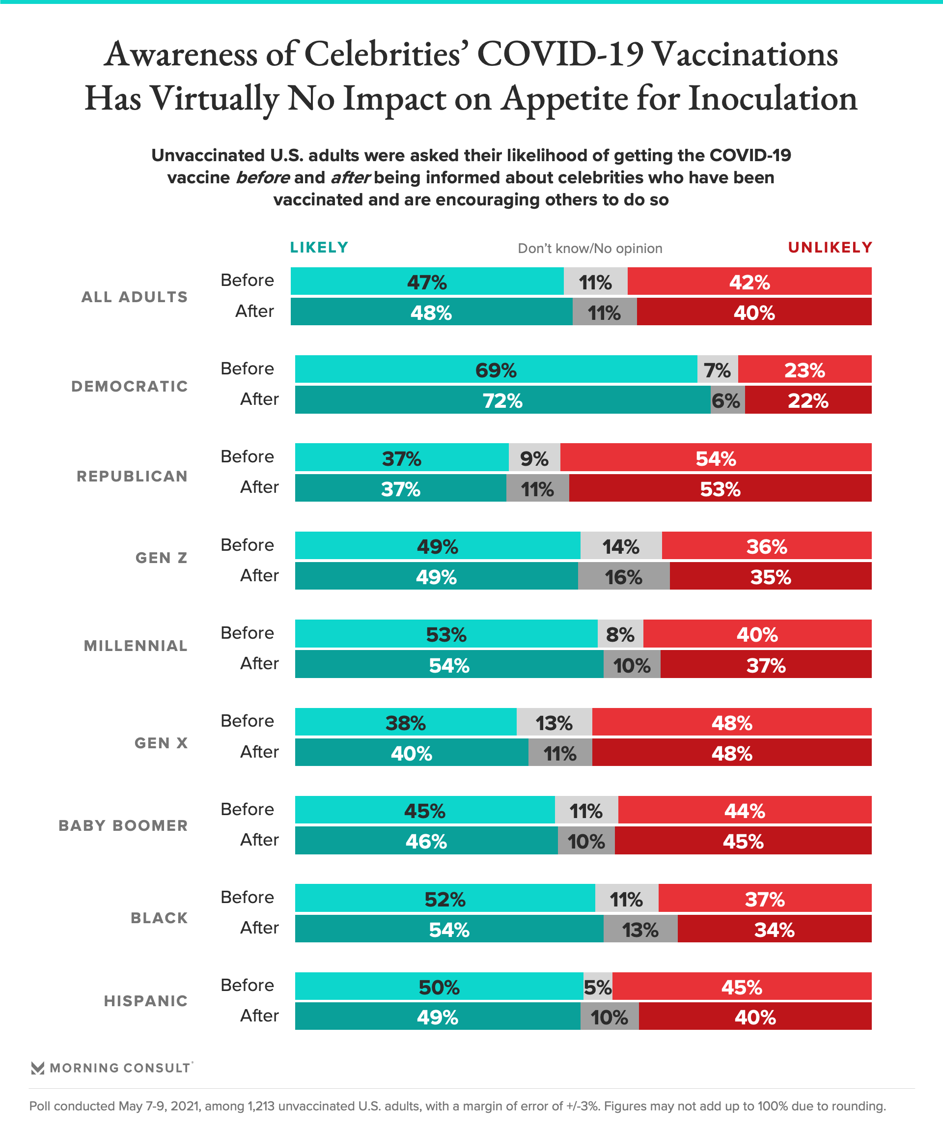 A May 7-9 Morning Consult survey asked 1,213 unvaccinated U.S. adults their likelihood of getting vaccinated against COVID-19, and then presented them with information about a variety of public figures and celebrities from across the political and cultural spectrum getting vaccinated. At the conclusion of the survey, respondents were again asked about their likelihood of taking a vaccine.