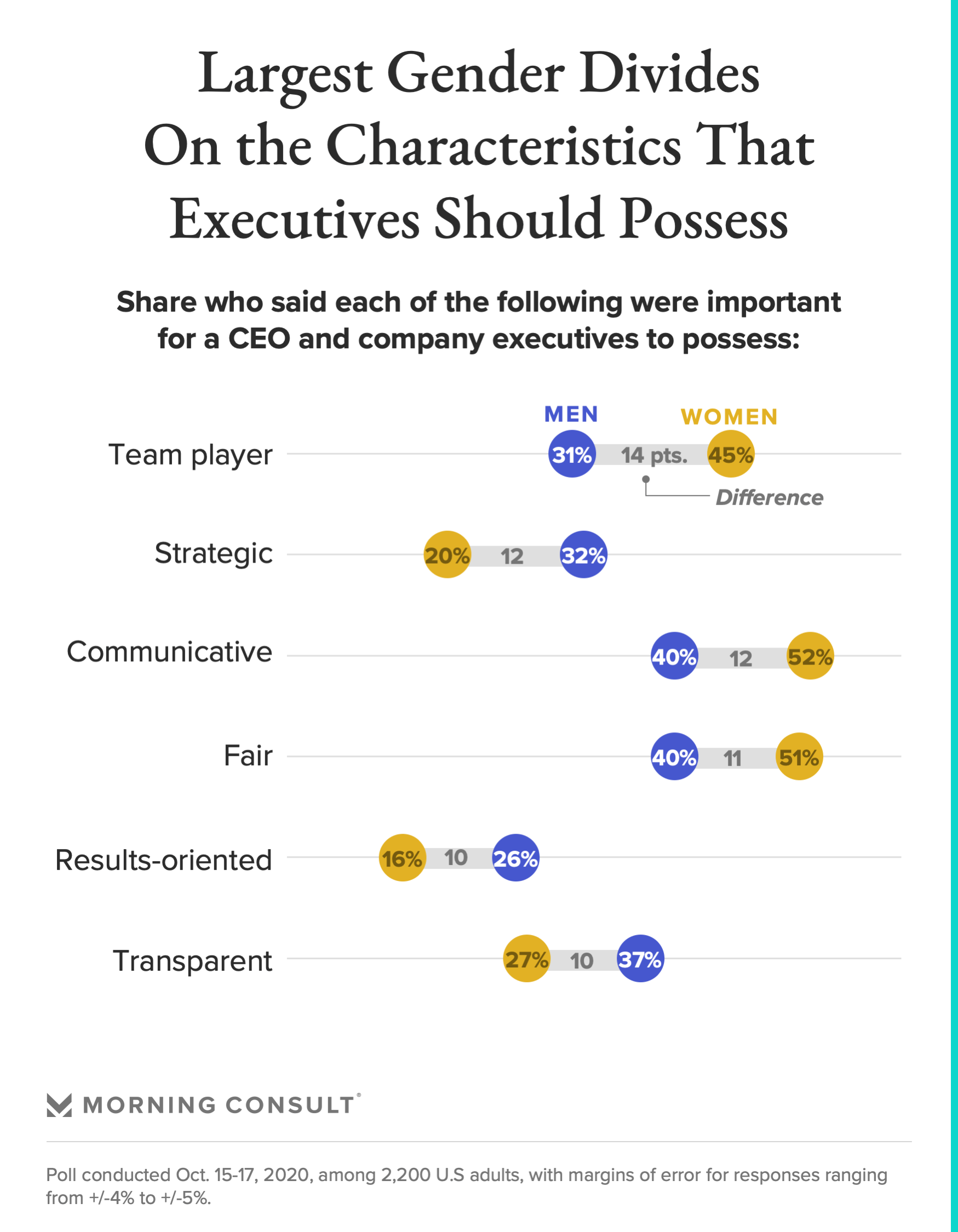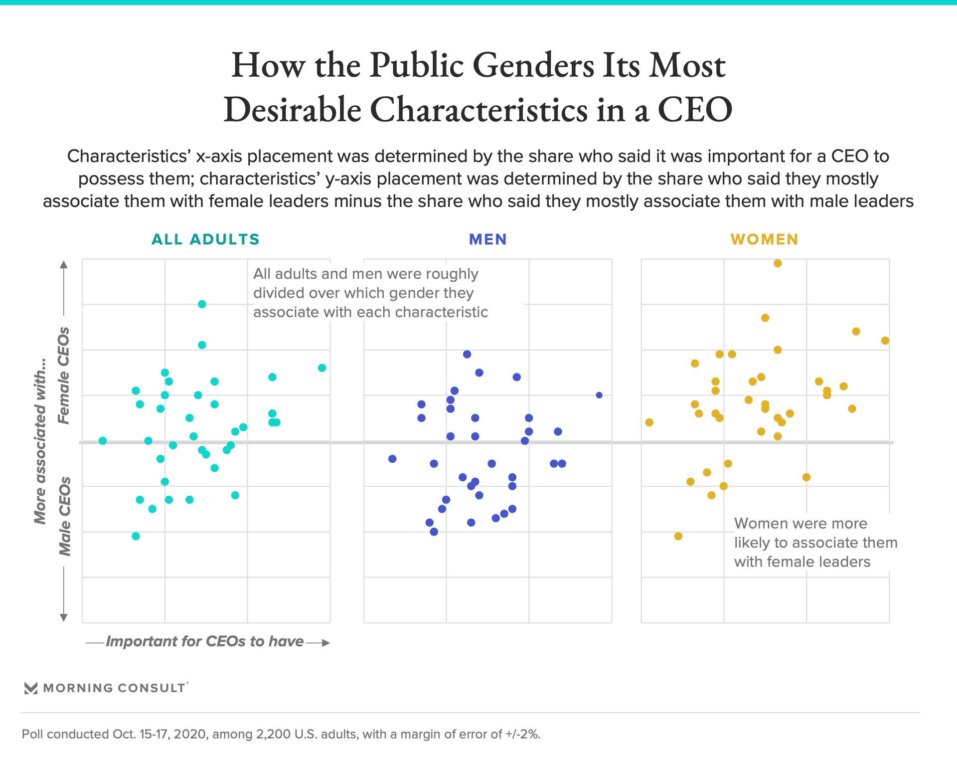 The data shows that women are ready to see themselves in top positions. Women overwhelmingly categorized their top leadership characteristics, such as “fair” and “integrity,” with female leaders, while men and the public overall were more of a mixed bag, according to Morning Consult analysis.
